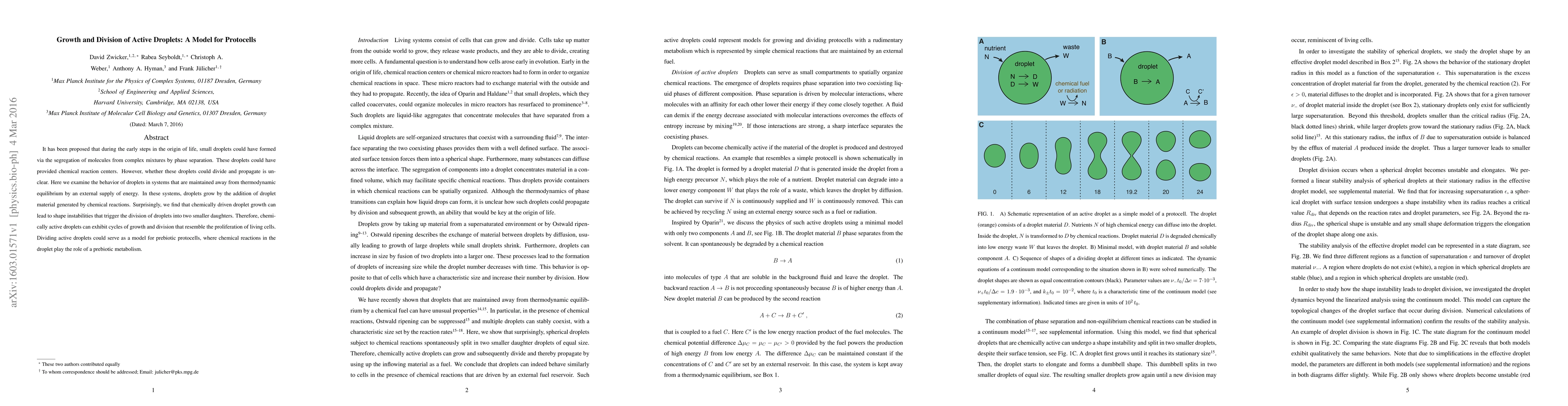 This research explores the growth and division of active droplets, suggesting they can undergo cycles of proliferation akin to living cells through chemical reactions, providing a model for prebiotic protocells. The study reveals that chemical activity can induce shape instabilities leading to droplet division, offering insights into the early stages of life.