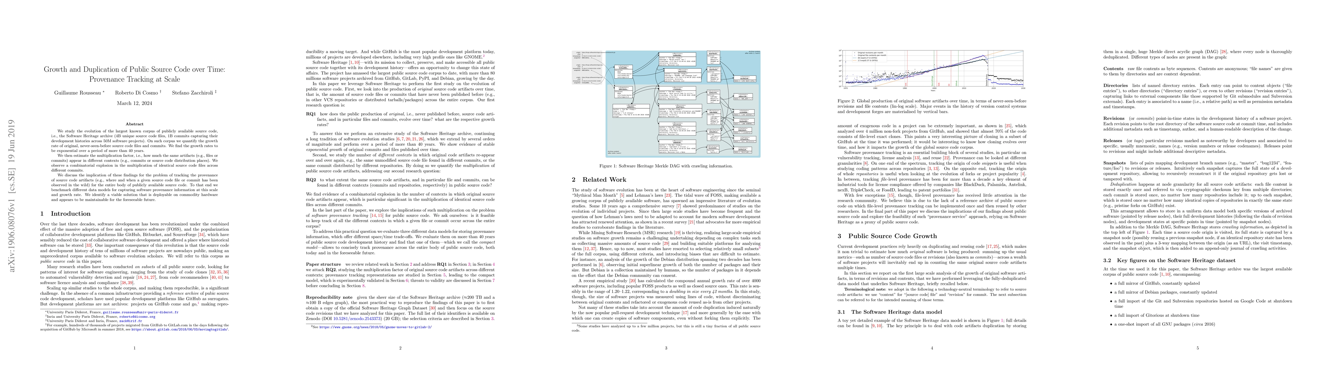 We study the evolution of the largest known corpus of publicly available source code, i.e., the Software Heritage archive (4B unique source code files, 1B commits capturing their development histories across 50M software projects). On such corpus we quantify the growth rate of original, never-seen-before source code files and commits. We find the growth rates to be exponential over a period of more than 40 years.We then estimate the multiplication factor, i.e., how much the same artifacts (e.g., files or commits) appear in different contexts (e.g., commits or source code distribution places). We observe a combinatorial explosion in the multiplication of identical source code files across different commits.We discuss the implication of these findings for the problem of tracking the provenance of source code artifacts (e.g., where and when a given source code file or commit has been observed in the wild) for the entire body of publicly available source code. To that end we benchmark different data models for capturing software provenance information at this scale and growth rate. We identify a viable solution that is deployable on commodity hardware and appears to be maintainable for the foreseeable future.