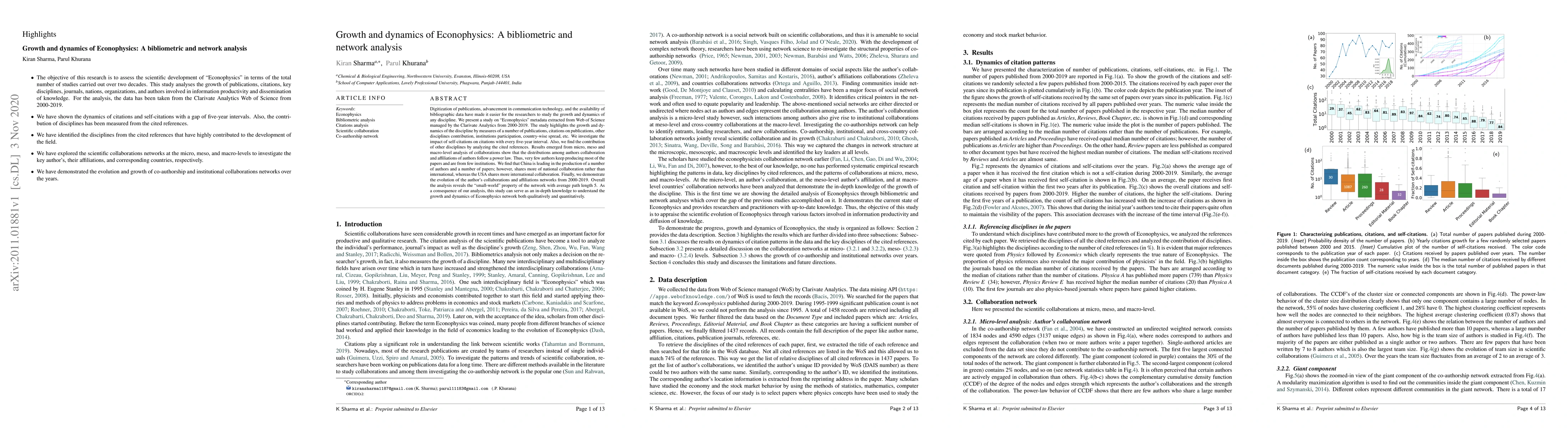 This study uses bibliometric and network analysis to examine the growth and dynamics of Econophysics from 2000-2019, revealing a power-law distribution in author collaborations and a "small-world" network property, with China leading in production but favoring national collaborations over international ones.
