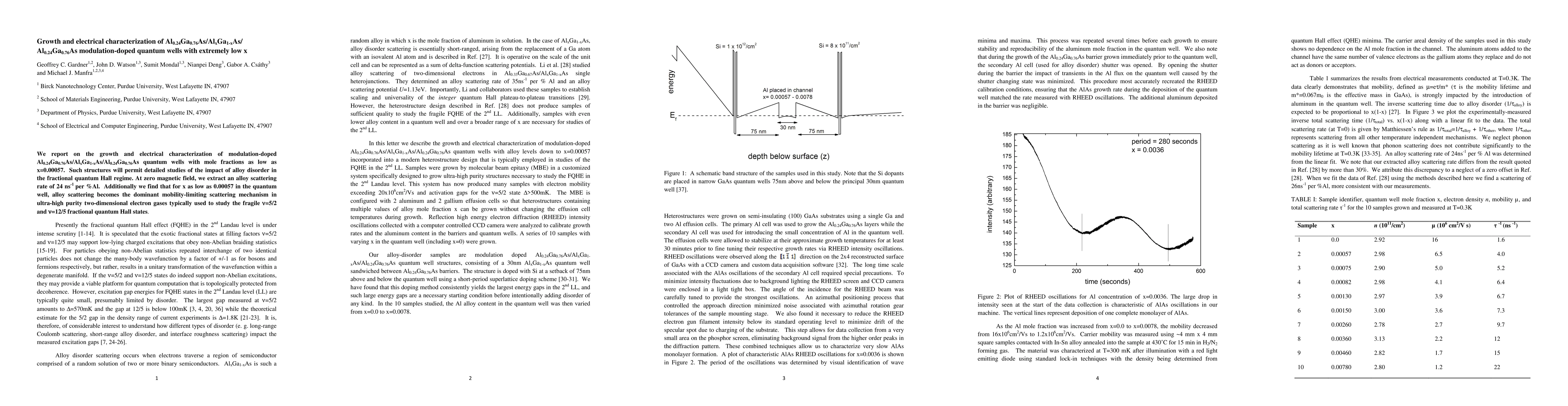 We report on the growth and electrical characterization of modulation-doped Al0.24Ga0.76As/AlxGa1-xAs/Al0.24Ga0.76As quantum wells with mole fractions as low as x=0.00057. Such structures will permit detailed studies of the impact of alloy disorder in the fractional quantum Hall regime. At zero magnetic field, we extract an alloy scattering rate of 24 ns-1 per %Al. Additionally we find that for x as low as 0.00057 in the quantum well, alloy scattering becomes the dominant mobility-limiting scattering mechanism in ultra-high purity two-dimensional electron gases typically used to study the fragile nu=5/2 and nu=12/5 fractional quantum Hall states.