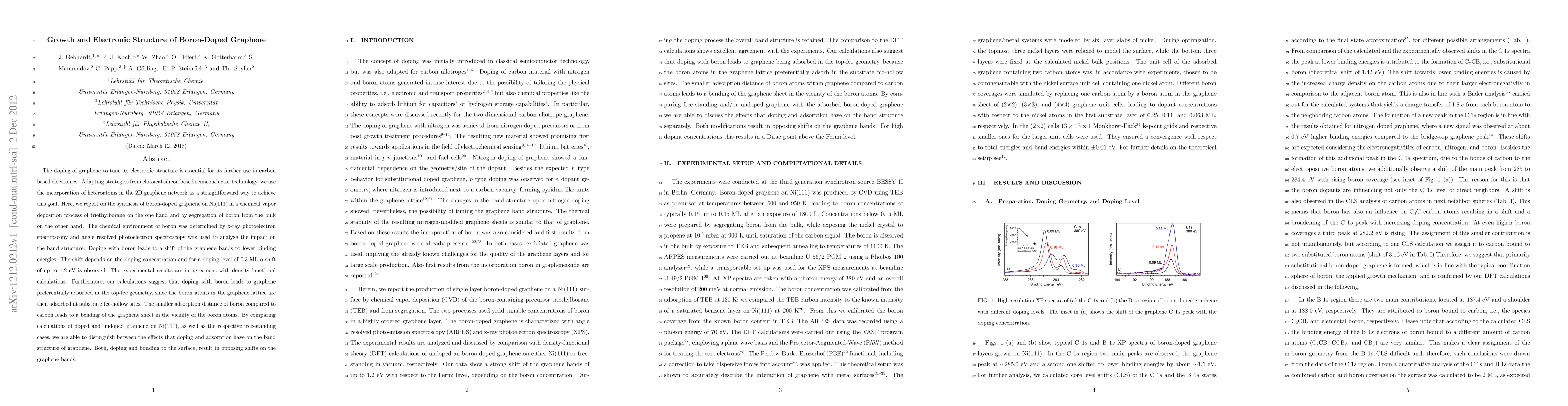 This paper investigates the synthesis and electronic structure of boron-doped graphene on Ni(111) via chemical vapor deposition and segregation methods. The study reveals that boron doping shifts graphene bands to lower binding energies, with a significant shift of up to 1.2 eV at 0.3 ML doping, corroborated by density-functional calculations.