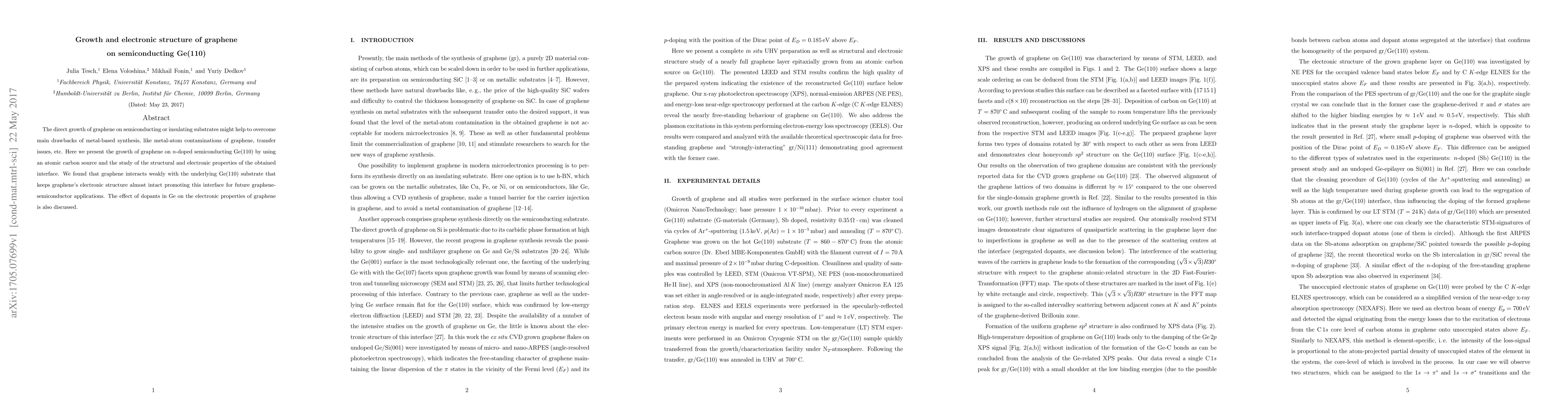 This study investigates the growth of graphene on n-doped semiconducting Ge(110) using an atomic carbon source, revealing weak interaction that preserves graphene's electronic structure, making it promising for future graphene-semiconductor applications. The influence of Ge dopants on graphene's electronic properties is also examined.