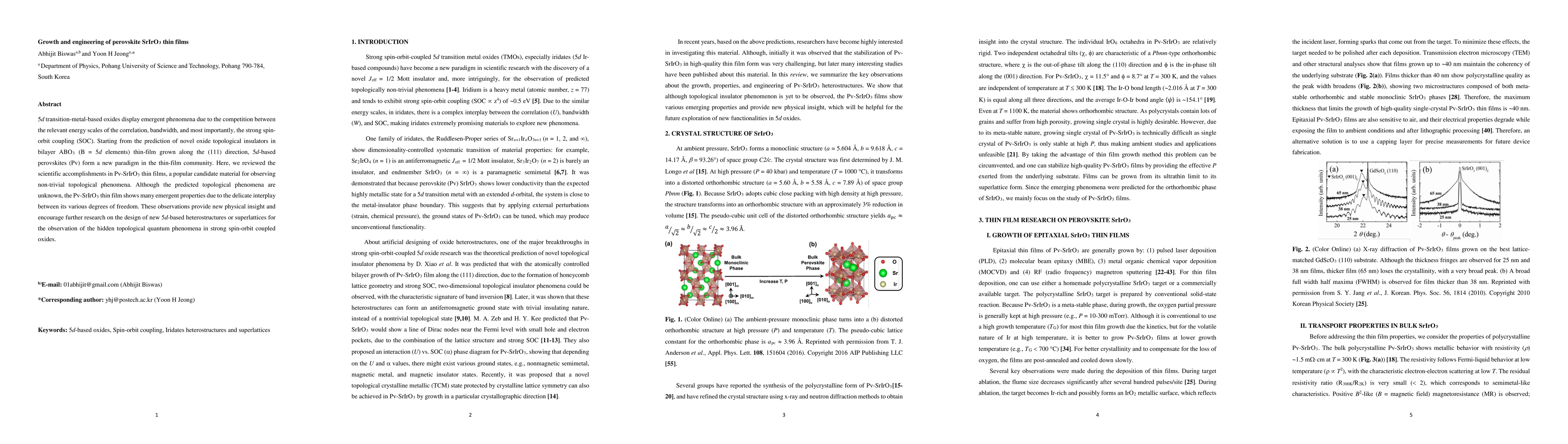 This paper reviews the growth and engineering of perovskite SrIrO3 thin films, highlighting their emergent properties due to strong spin-orbit coupling and the potential for observing novel topological phenomena. The study underscores the importance of these materials for future research into 5d-based heterostructures.