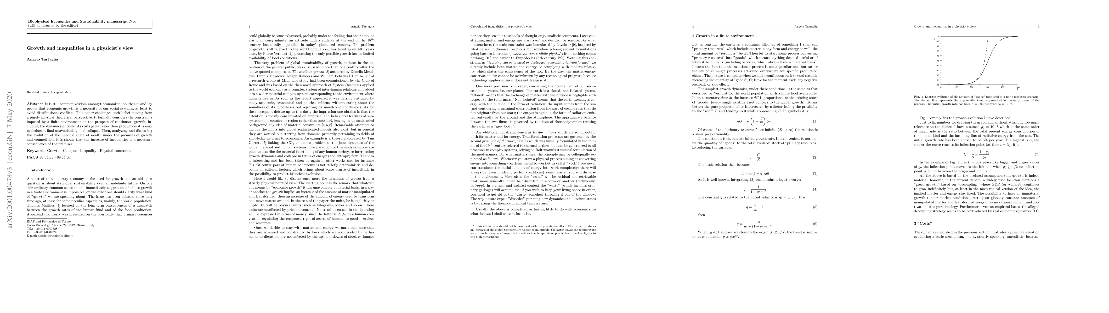 It is still common wisdom amongst economists, politicians and lay people that economic growth is a necessity of our social systems, at least to avoid distributional conflicts. This paper challenges such belief moving from a purely physical theoretical perspective. It formally considers the constraints imposed by a finite environment on the prospect of continuous growth, including the dynamics of costs. As costs grow faster than production it is easy to deduce a final unavoidable global collapse. Then, analyzing and discussing the evolution of the unequal share of wealth under the premises of growth and competition, it is shown that the increase of inequalities is a necessary consequence of the premises.