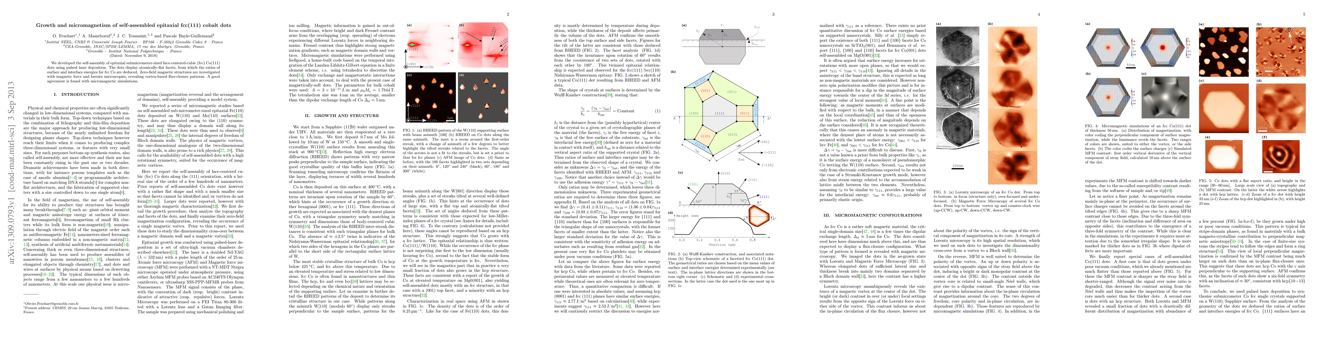 We developed the self-assembly of epitaxial submicrometer-sized face-centered-cubic (fcc) Co(111) dots using pulsed laser deposition. The dots display atomically-fl at facets, from which the ratios of surface and interface energies for fcc Co are deduced. Zero- field magnetic structures are investigated with magnetic force and lorentz microscopies, revealing vortex-based flux-closure patterns. A good agreement is found with micromagnetic simulations.