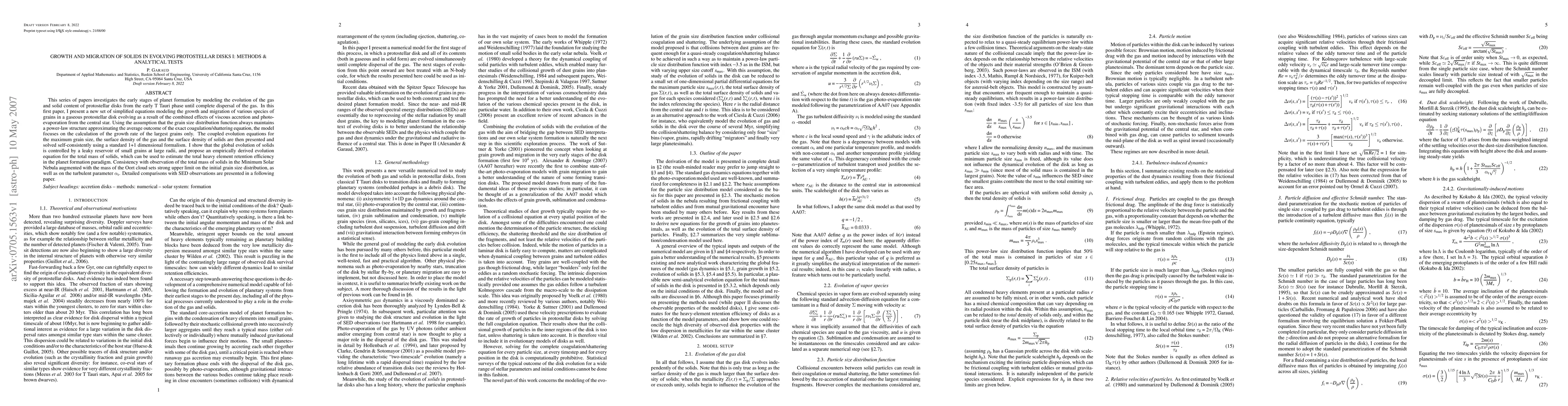 This series of papers investigates the early stages of planet formation by modeling the evolution of the gas and solid content of protostellar disks from the early T Tauri phase until complete dispersal of the gas. In this first paper, I present a new set of simplified equations modeling the growth and migration of various species of grains in a gaseous protostellar disk evolving as a result of the combined effects of viscous accretion and photo-evaporation from the central star. Using the assumption that the grain size distribution function always maintains a power-law structure approximating the average outcome of the exact coagulation/shattering equation, the model focuses on the calculation of the growth rate of the largest grains only. The coupled evolution equations for the maximum grain size, the surface density of the gas and the surface density of solids are then presented and solved self-consistently using a standard 1+1 dimensional formalism. I show that the global evolution of solids is controlled by a leaky reservoir of small grains at large radii, and propose an empirically derived evolution equation for the total mass of solids, which can be used to estimate the total heavy element retention efficiency in the planet formation paradigm. Consistency with observation of the total mass of solids in the Minimum Solar Nebula augmented with the mass of the Oort cloud sets strong upper limit on the initial grain size distribution, as well as on the turbulent parameter $\alphat$. Detailed comparisons with SED observations are presented in a following paper.