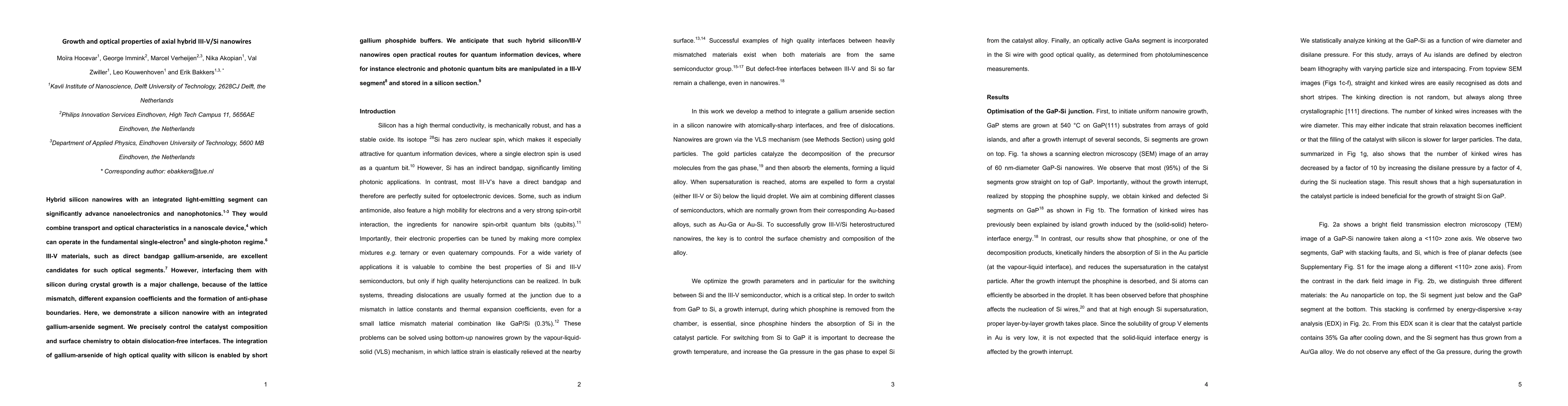 This paper demonstrates the successful growth of axial hybrid III-V/Si nanowires, integrating gallium-arsenide segments with silicon nanowires, facilitated by short gallium phosphide buffers to overcome lattice mismatch challenges, thus promising advancements in nanoelectronics and quantum information technologies.