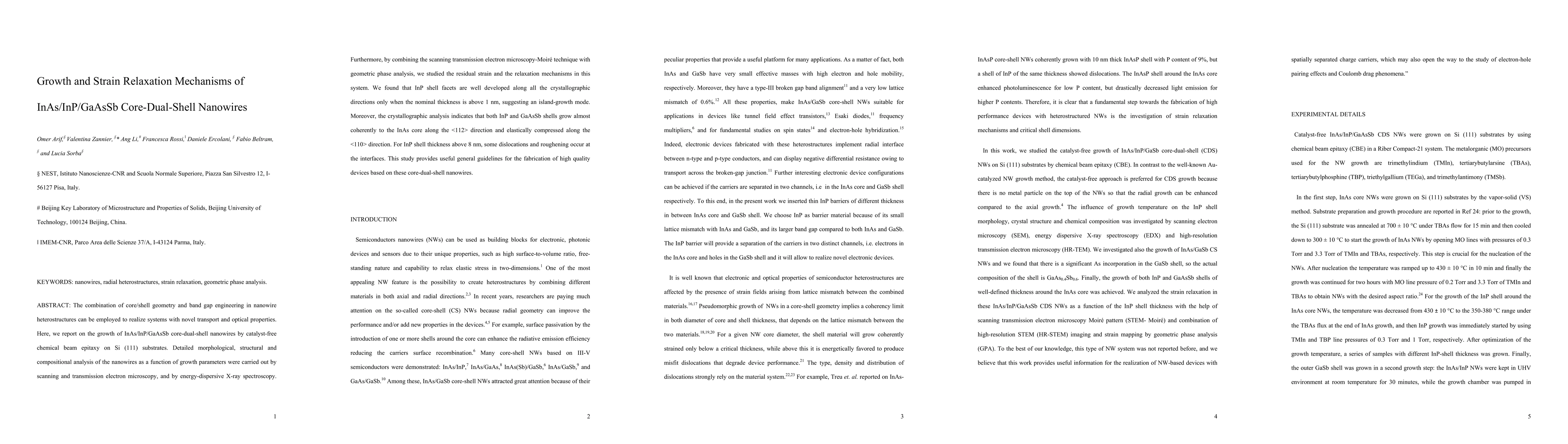 The paper investigates the growth and strain relaxation mechanisms of InAs/InP/GaAsSb core-dual-shell nanowires using catalyst-free chemical beam epitaxy, revealing coherent growth and strain relaxation for certain thicknesses, while identifying dislocations and interface roughening at greater InP shell thicknesses.