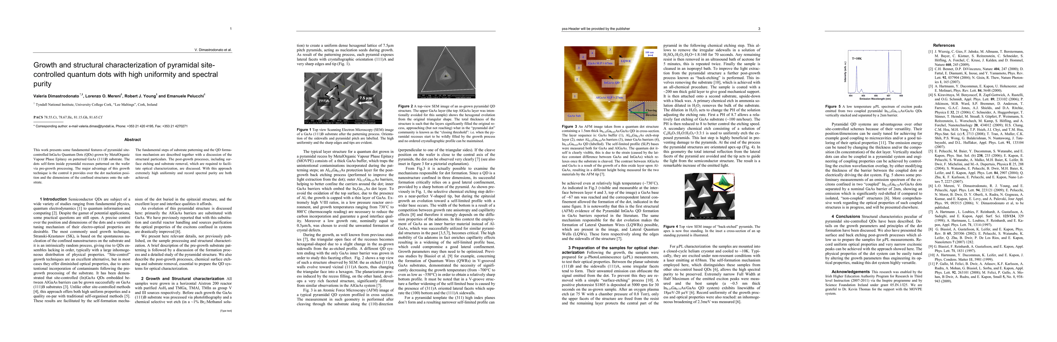 This work presents some fundamental features of pyramidal site-controlled InGaAs Quantum Dots (QDs) grown by MetalOrganic Vapour Phase Epitaxy on patterned GaAs (111)B substrate. The dots self-form inside pyramidal recesses patterned on the wafer via pre-growth processing. The major advantage of this growth technique is the control it provides over the dot nucleation posi-tion and the dimensions of the confined structures onto the sub-strate. The fundamental steps of substrate patterning and the QD forma-tion mechanism are described together with a discussion of the structural particulars. The post-growth processes, including sur-face etching and substrate removal, which are required to facili-tate optical characterization, are discussed. With this approach extremely high uniformity and record spectral purity are both achieved.