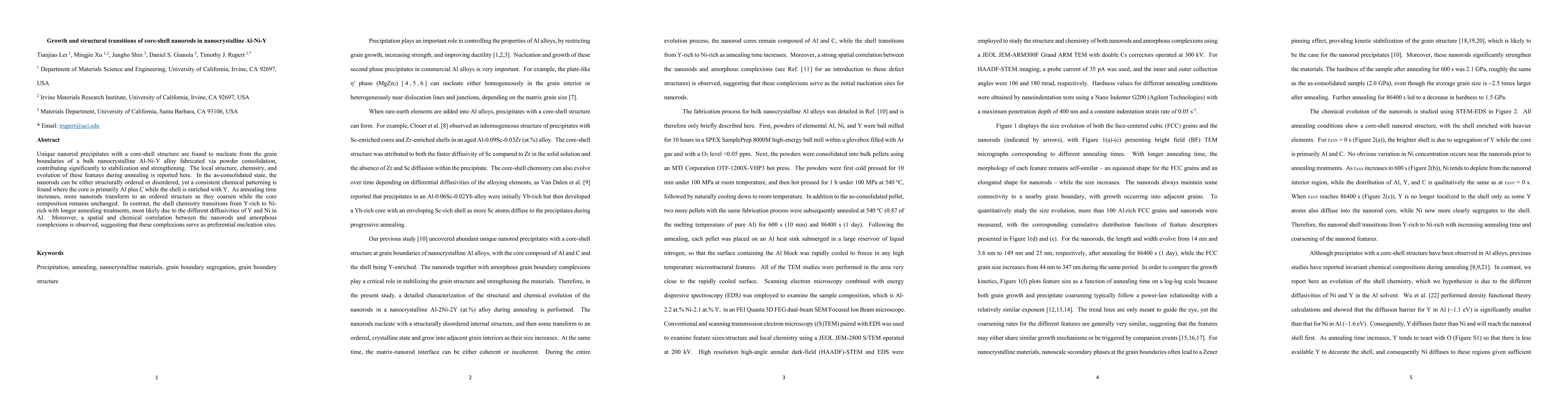 This study reveals the formation and structural evolution of core-shell nanorods in nanocrystalline Al-Ni-Y alloy, highlighting their role in stabilization. Upon annealing, the nanorods transition to ordered structures while maintaining an Al-rich core and changing from Y-rich to Ni-rich shells, indicating diffusion-driven compositional shifts.
