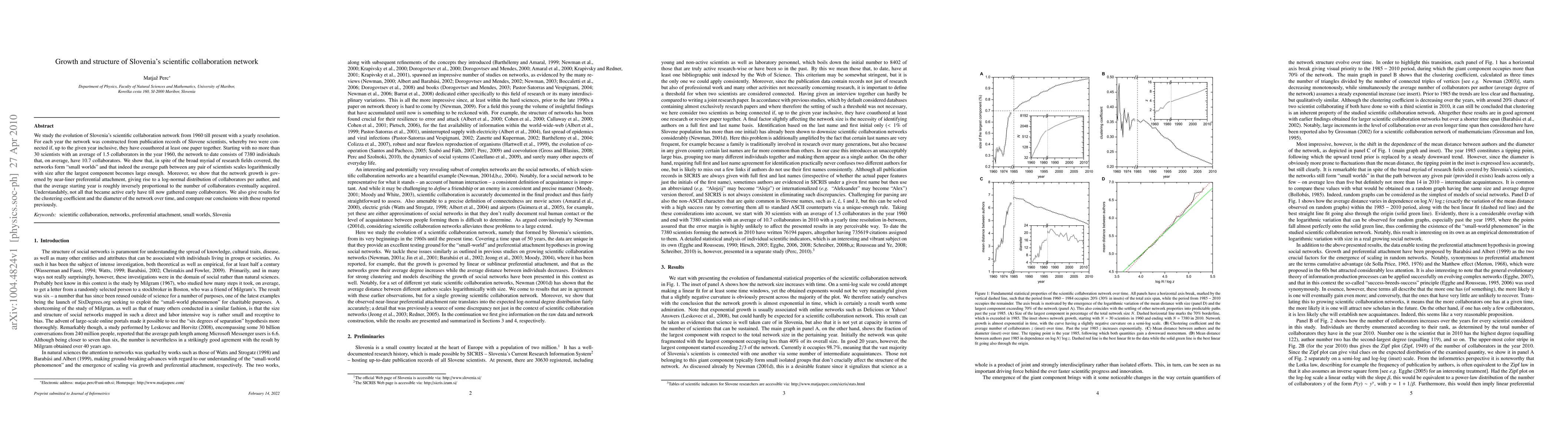This paper examines the evolution of Slovenia's scientific collaboration network from 1960 to the present, revealing a growth from 30 scientists to 7380 with an average of 10.7 collaborators. The network exhibits "small world" properties and follows a logarithmic scaling law for average path length.