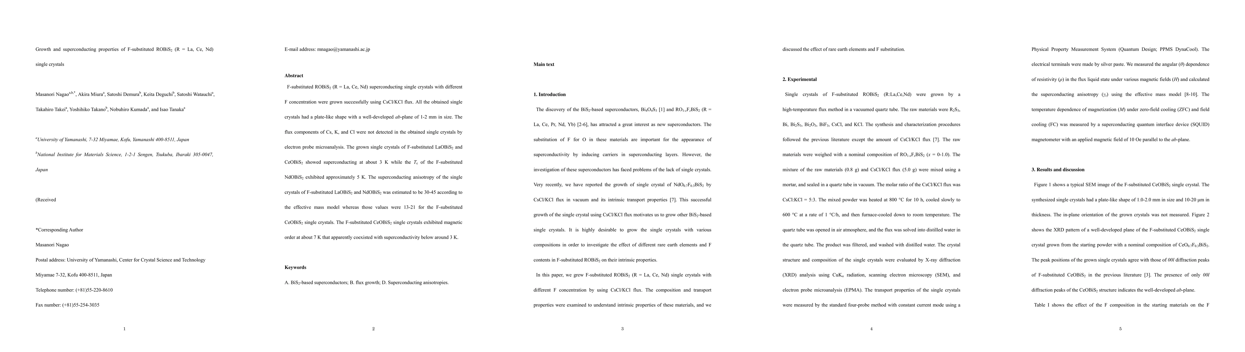 F-substituted ROBiS2 (R = La, Ce, Nd) superconducting single crystals were grown successfully using CsCl/KCl flux, showing superconductivity at 3-5 K with varying anisotropy, and F-substituted CeOBiS2 exhibiting coexisting magnetic order and superconductivity.