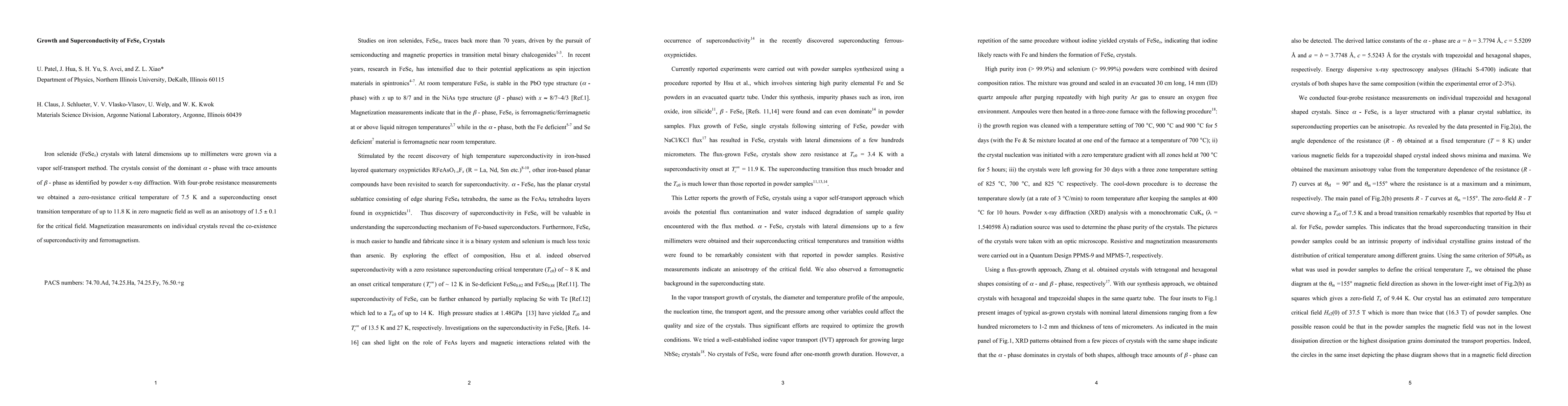 Iron selenide (FeSex) crystals with lateral dimensions up to millimeters were grown via a vapor self-transport method. The crystals consist of the dominant alpha - phase with trace amounts of beta- phase as identified by powder x-ray diffraction. With four-probe resistance measurements we obtained a zero-resistance critical temperature of 7.5 K and a superconducting onset transition temperature of up to 11.8 K in zero magnetic field as well as an anisotropy of 1.5 +- 0.1 for the critical field. Magnetization measurements on individual crystals reveal the co-existence of superconductivity and ferromagnetism.