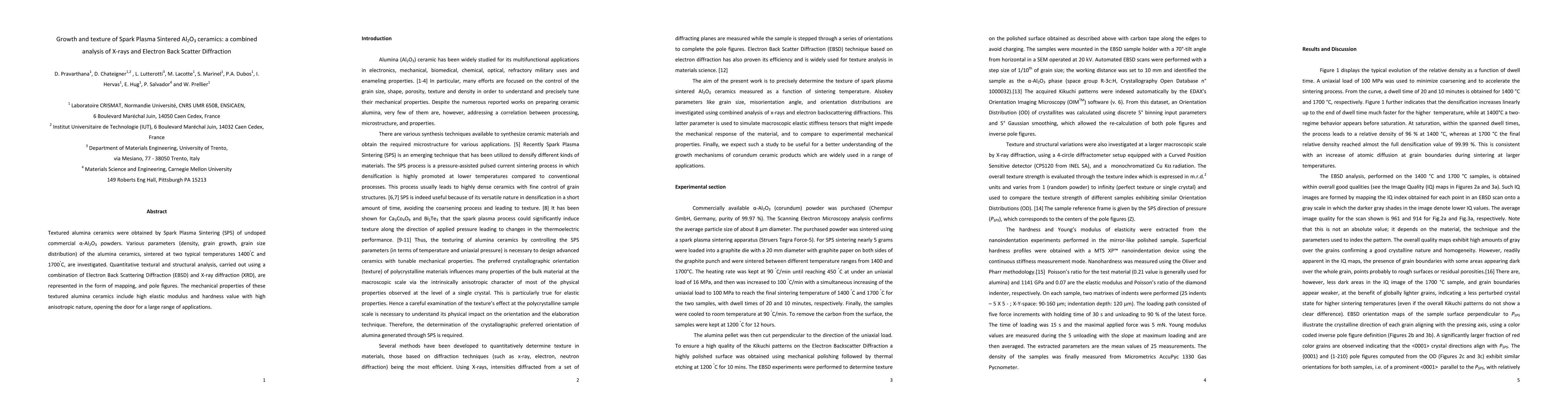 This study investigates the growth and texture of textured alumina ceramics produced via Spark Plasma Sintering, analyzing grain size and distribution using Electron Back Scattering Diffraction and X-ray diffraction. The ceramics exhibit high elastic modulus, hardness, and anisotropic mechanical properties, promising for diverse applications.