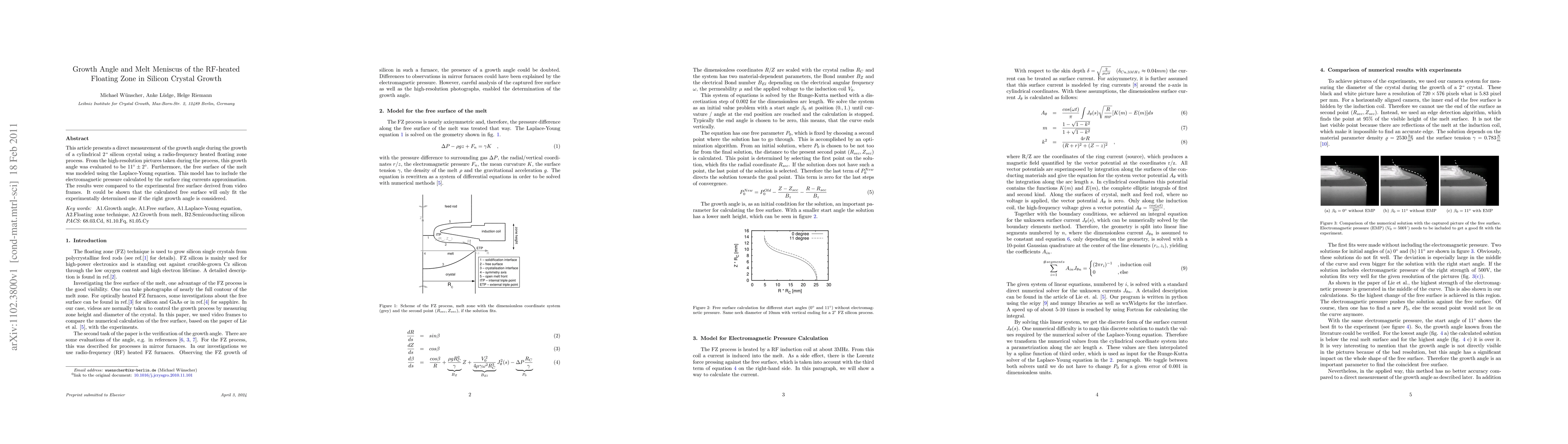 Researchers measured the growth angle of a silicon crystal grown using a radio-frequency heated floating zone process, finding it to be 11 degrees with an accuracy of ²2 degrees. The modelled melt surface matched experimental data only when the correct growth angle was considered.
