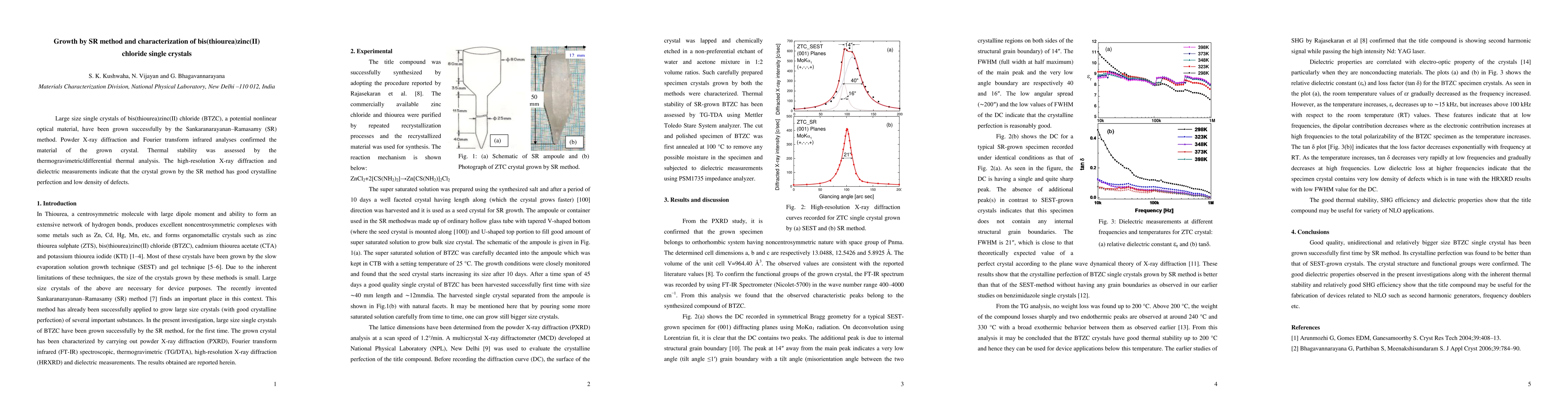 Large size single crystals of bis(thiourea)zinc(II) chloride (BTZC), a potential nonlinear optical material, have been grown successfully by the Sankaranarayanan Ramasamy (SR) method. Powder X-ray diffraction and Fourier transform infrared analyses confirmed the material of the grown crystal. Thermal stability was assessed by the thermogravimetric differential thermal analysis. The high-resolution X-ray diffraction and dielectric measurements indicate that the crystal grown by the SR method has good crystalline perfection and low density of defects.