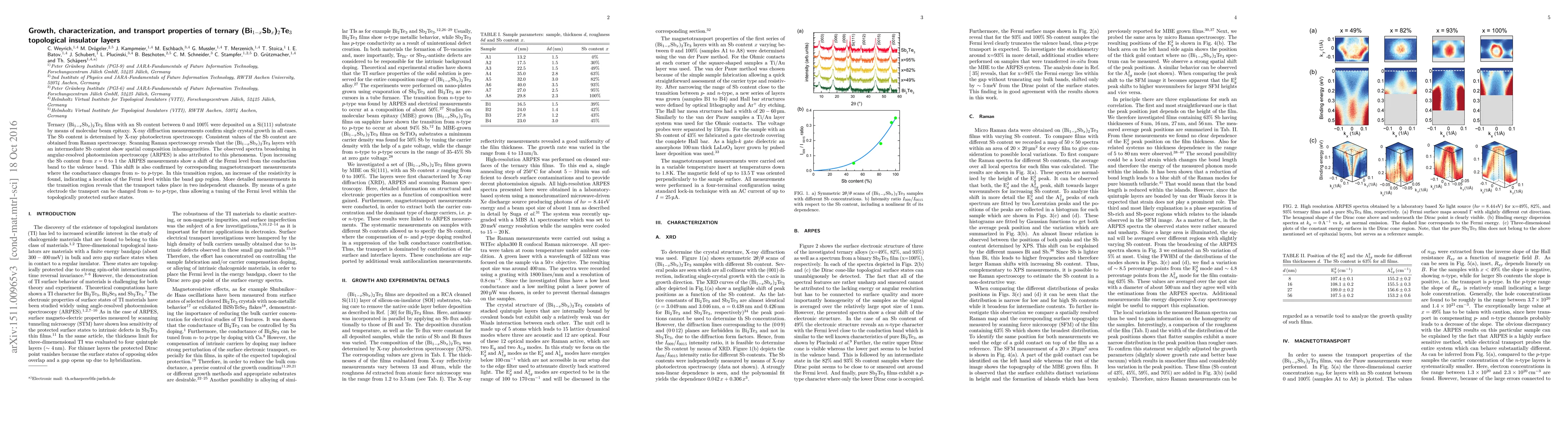 This paper investigates the growth and transport properties of ternary (Bi1-xSbx)2Te3 topological insulator layers, showing that Sb doping shifts the Fermi level from conduction to valence band, confirmed by ARPES and magnetotransport measurements. The study reveals two independent transport channels in the transition region and demonstrates Fermi level tuning via a gate electrode.