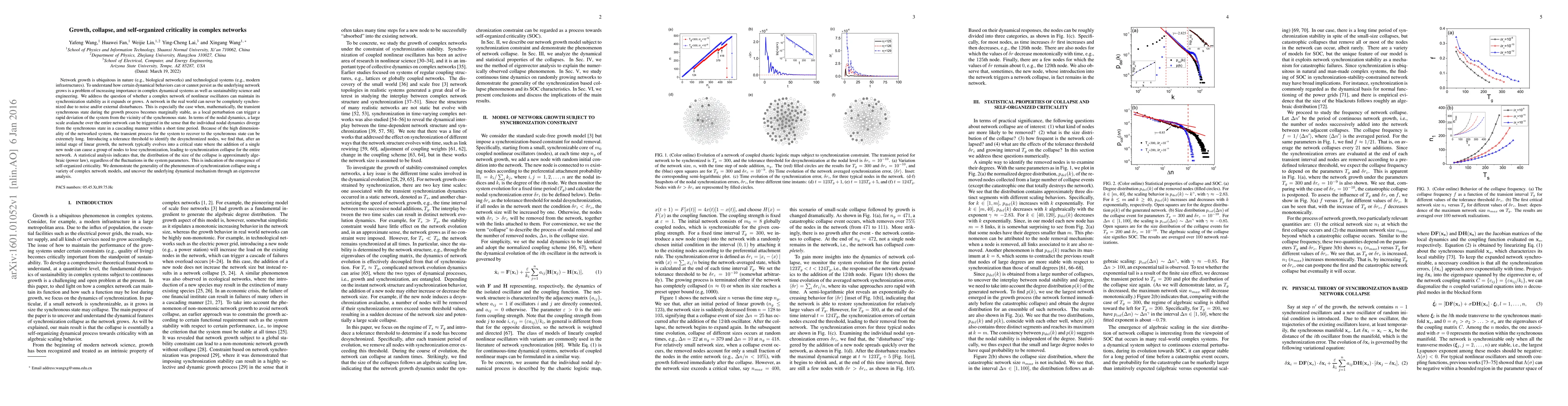 To understand how certain dynamical behaviors can or cannot persist as the underlying network grows is a problem of increasing importance in complex dynamical systems as well as sustainability science and engineering. We address the question of whether a complex network of nonlinear oscillators can maintain its synchronization stability as it expands or grows. A network in the real world can never be completely synchronized due to noise and/or external disturbances. This is especially the case when, mathematically, the transient synchronous state during the growth process becomes marginally stable, as a local perturbation can trigger a rapid deviation of the system from the vicinity of the synchronous state. In terms of the nodal dynamics, a large scale avalanche over the entire network can be triggered in the sense that the individual nodal dynamics diverge from the synchronous state in a cascading manner within a short time period. Because of the high dimensionality of the networked system, the transient process for the system to recover to the synchronous state can be extremely long. Introducing a tolerance threshold to identify the desynchronized nodes, we find that, after an initial stage of linear growth, the network typically evolves into a critical state where the addition of a single new node can cause a group of nodes to lose synchronization, leading to synchronization collapse for the entire network. A statistical analysis indicates that, the distribution of the size of the collapse is approximately algebraic (power law), regardless of the fluctuations in the system parameters. This is indication of the emergence of self-organized criticality. We demonstrate the generality of the phenomenon of synchronization collapse using a variety of complex network models, and uncover the underlying dynamical mechanism through an eigenvector analysis.