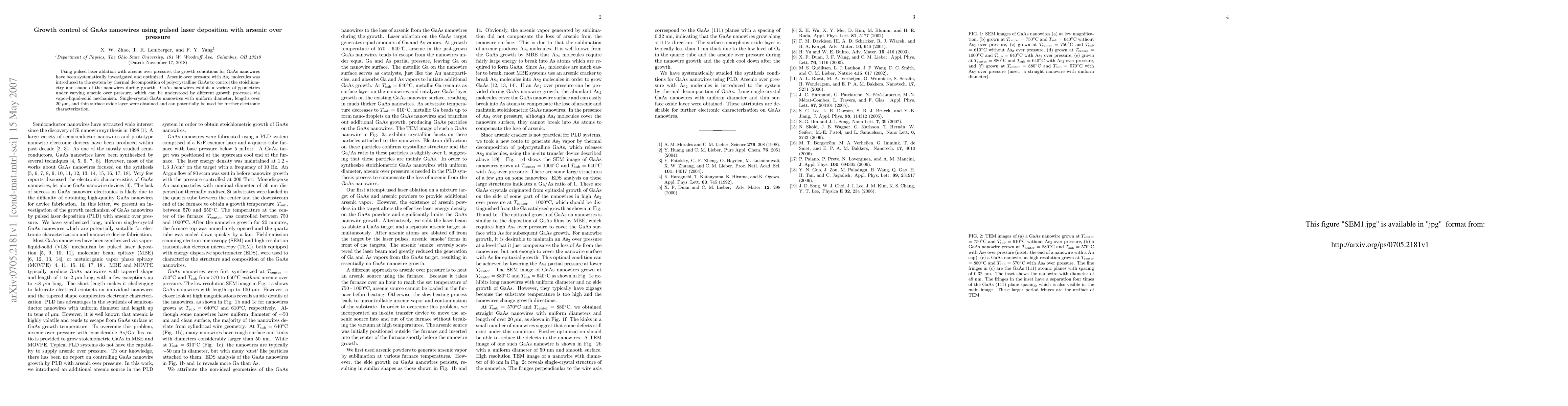 Summary: This study optimizes the growth of GaAs nanowires using pulsed laser deposition with arsenic over pressure, achieving single-crystal structures with uniform diameters and lengths exceeding 20 µm. The varying geometries of the nanowires are attributed to different growth processes via the vapor-liquid-solid mechanism.
