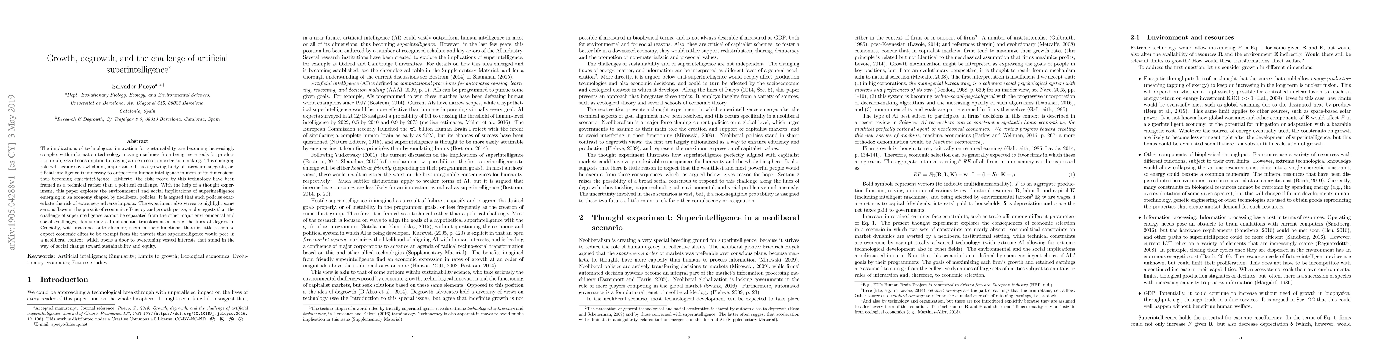 The implications of technological innovation for sustainability are becoming increasingly complex with information technology moving machines from being mere tools for production or objects of consumption to playing a role in economic decision making. This emerging role will acquire overwhelming importance if, as a growing body of literature suggests, artificial intelligence is underway to outperform human intelligence in most of its dimensions, thus becoming "superintelligence". Hitherto, the risks posed by this technology have been framed as a technical rather than a political challenge. With the help of a thought experiment, this paper explores the environmental and social implications of superintelligence emerging in an economy shaped by neoliberal policies. It is argued that such policies exacerbate the risk of extremely adverse impacts. The experiment also serves to highlight some serious flaws in the pursuit of economic efficiency and growth per se, and suggests that the challenge of superintelligence cannot be separated from the other major environmental and social challenges, demanding a fundamental transformation along the lines of degrowth. Crucially, with machines outperforming them in their functions, there is little reason to expect economic elites to be exempt from the threats that superintelligence would pose in a neoliberal context, which opens a door to overcoming vested interests that stand in the way of social change toward sustainability and equity.