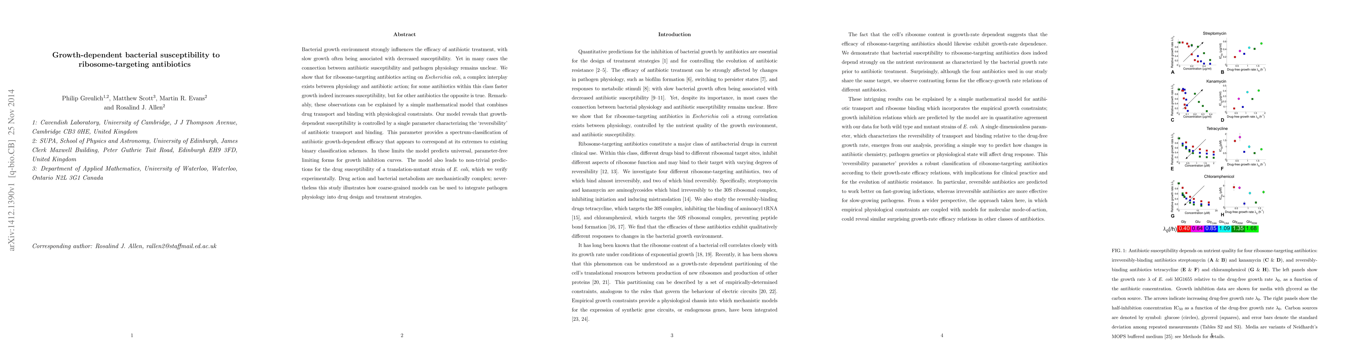 This study reveals that bacterial growth rate significantly influences susceptibility to ribosome-targeting antibiotics in Escherichia coli, with varying effects depending on the specific antibiotic. A mathematical model combining drug transport and physiological constraints explains these growth-dependent effects, highlighting a single parameter that governs antibiotic efficacy.