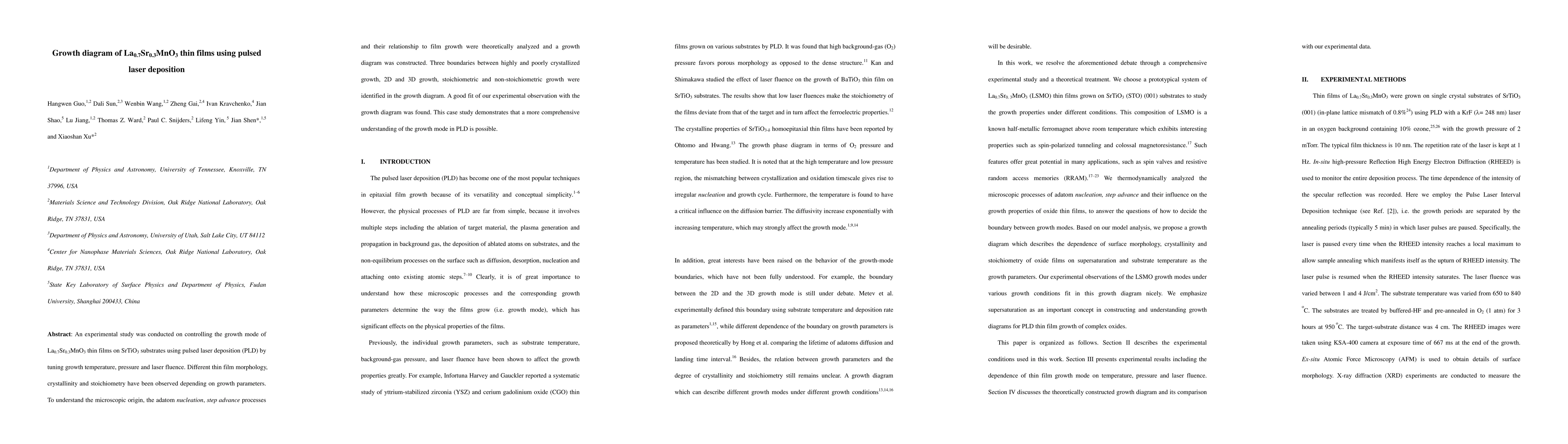 This study explores controlling the growth mode of La0.7Sr0.3MnO3 thin films via pulsed laser deposition by adjusting temperature, pressure, and laser fluence, revealing varied film morphology and crystallinity. A growth diagram was constructed to model the adatom nucleation and step advance processes, identifying three boundaries for crystallized, dimensional, and stoichiometric growth.