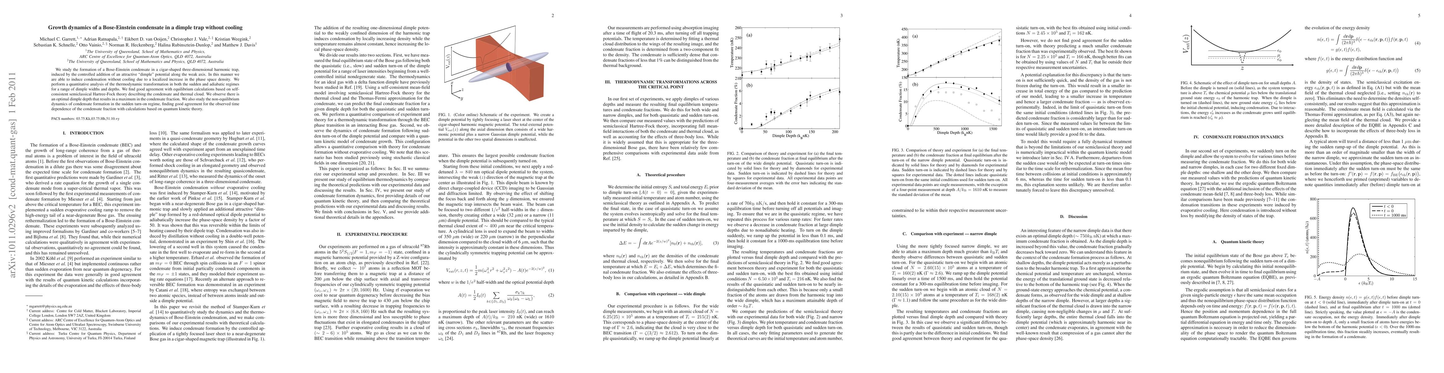 This paper investigates the formation of a Bose-Einstein condensate in a harmonic trap enhanced by an attractive dimple potential, achieving condensation without cooling. The study finds an optimal dimple depth maximizing the condensate fraction and validates theoretical models against experimental observations.
