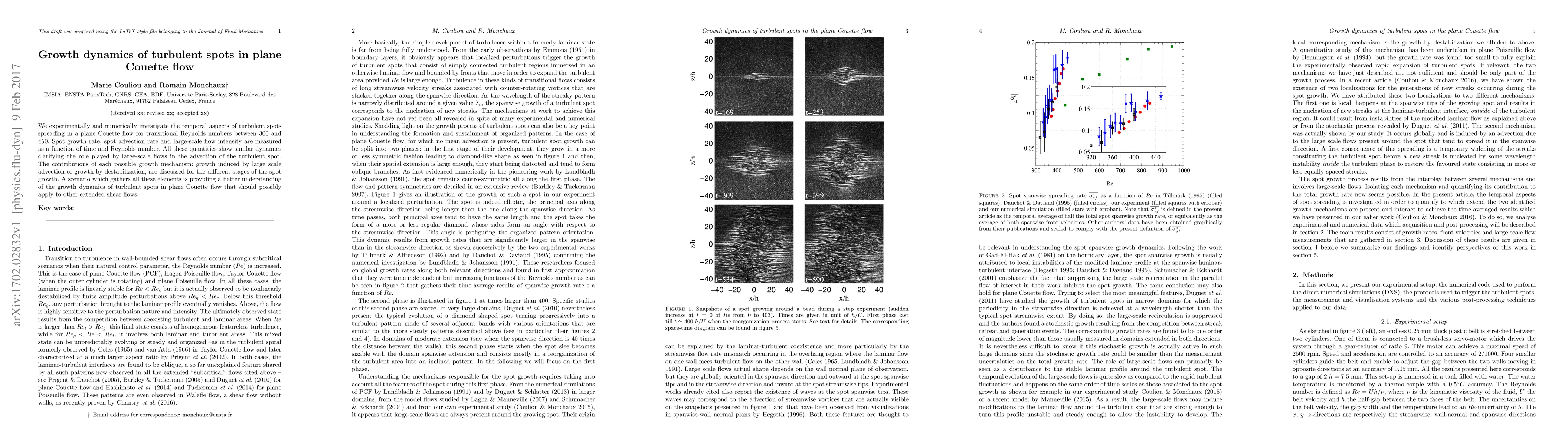 The study experimentally and numerically analyzes turbulent spot growth in plane Couette flow, finding similar dynamics for spot growth rate, advection rate, and large-scale flow intensity, highlighting the influence of large-scale flows on turbulent spot propagation and offering a comprehensive scenario for spot growth mechanisms across various stages.