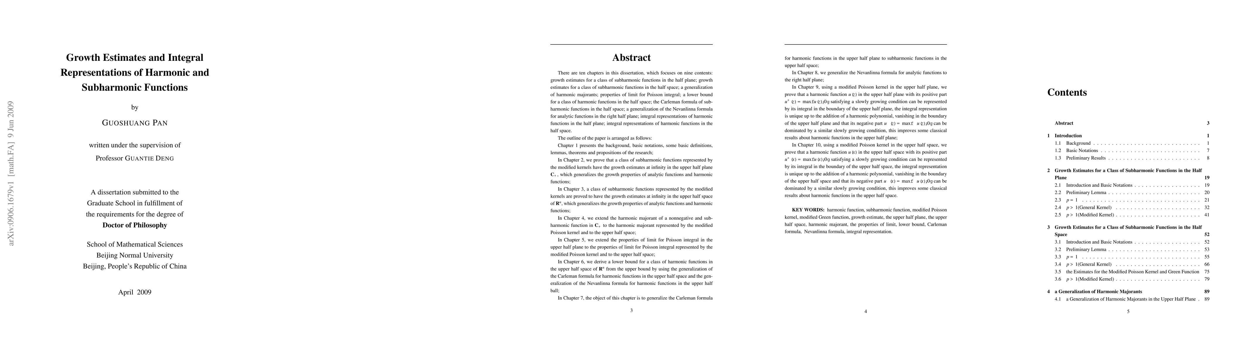 There are ten chapters in this dissertation, which focuses on nine contents: growth estimates for a class of subharmonic functions in the half plane; growth estimates for a class of subharmonic functions in the half space; a generalization of harmonic majorants; properties of limit for Poisson integral; a lower bound for a class of harmonic functions in the half space; the Carleman formula of subharmonic functions in the half space; a generalization of the Nevanlinna formula for analytic functions in the right half plane; integral representations of harmonic functions in the half plane; integral representations of harmonic functions in the half space.