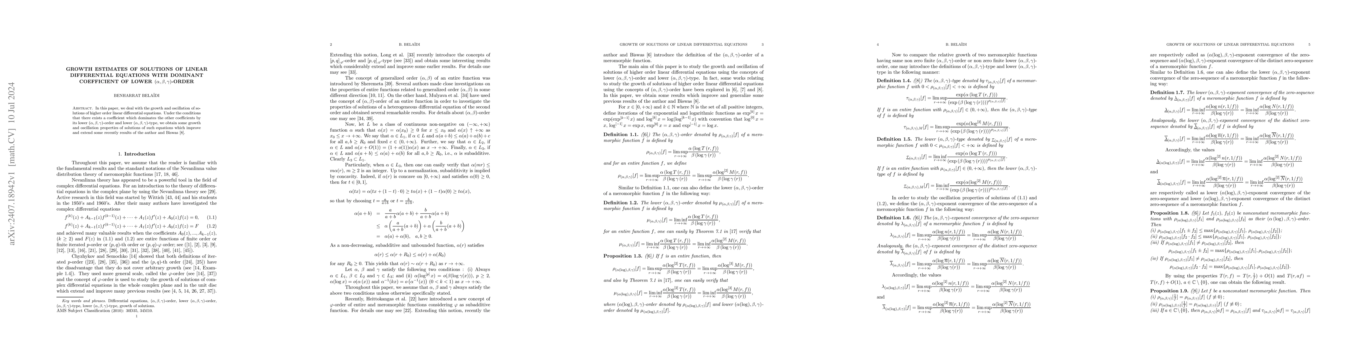 This paper investigates the growth and oscillation behavior of solutions to higher-order linear differential equations where one coefficient dominates in lower $(\alpha,\beta,\gamma)$-order and type, providing improved results that extend previous findings by the author and Biswas.