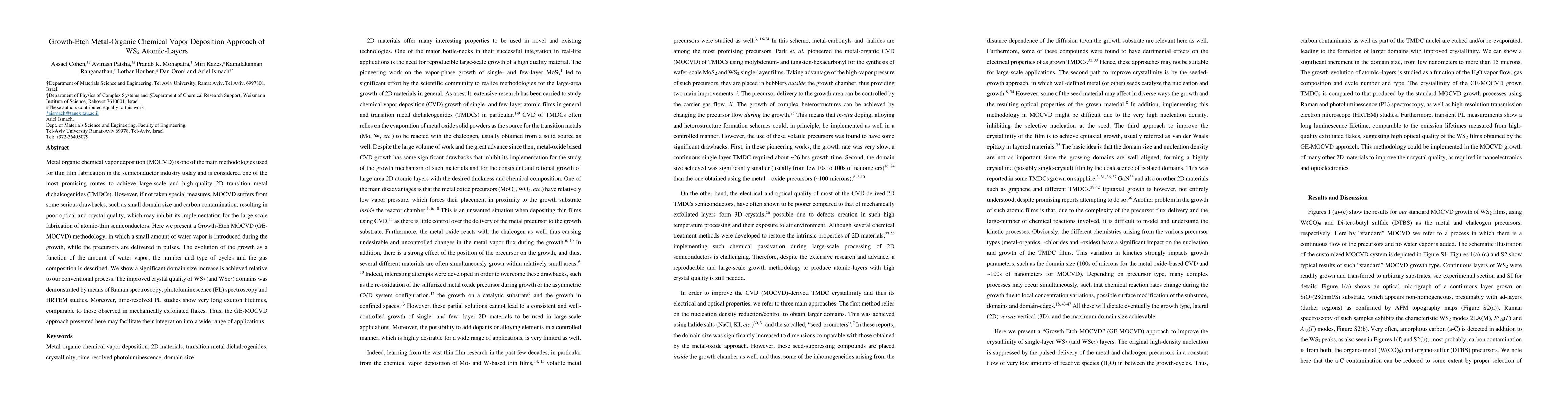 This paper introduces a Growth-Etch Metal Organic Chemical Vapor Deposition (GE-MOCVD) approach to enhance the fabrication of large-domain, high-quality WS2 atomic layers, significantly improving domain size and crystal quality compared to conventional MOCVD methods. The improved quality is demonstrated via Raman, photoluminescence spectroscopy, and HRTEM studies, showing long exciton lifetimes akin to mechanically exfoliated samples.