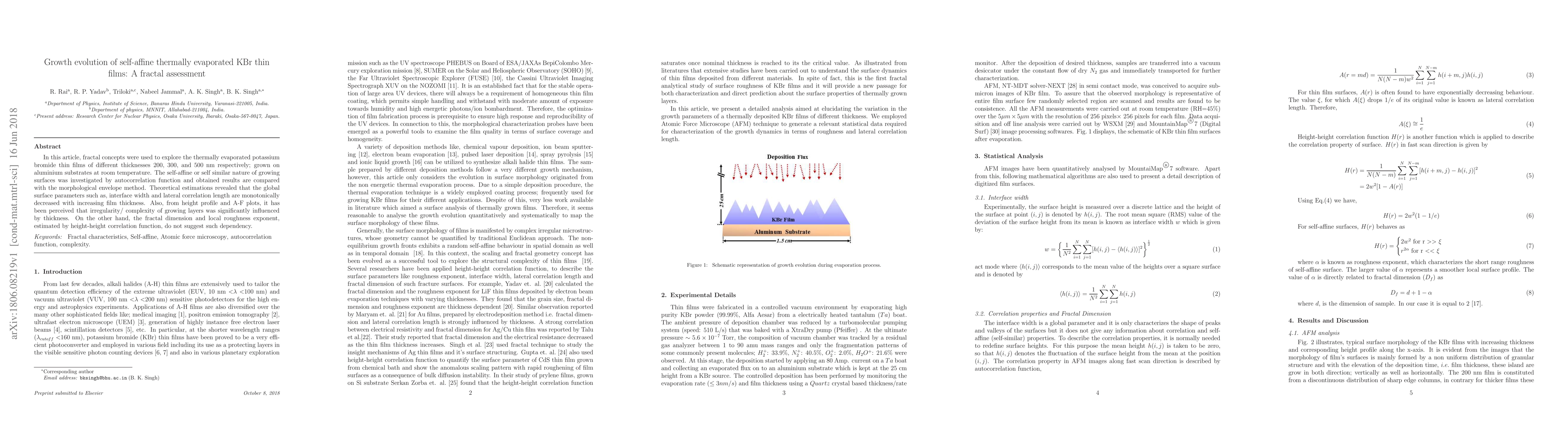 This study explores the fractal growth of thermally evaporated KBr thin films of varying thicknesses using fractal concepts. Results show that surface parameters like interface width and lateral correlation length decrease with increasing film thickness, while fractal dimension and local roughness remain unaffected by thickness.