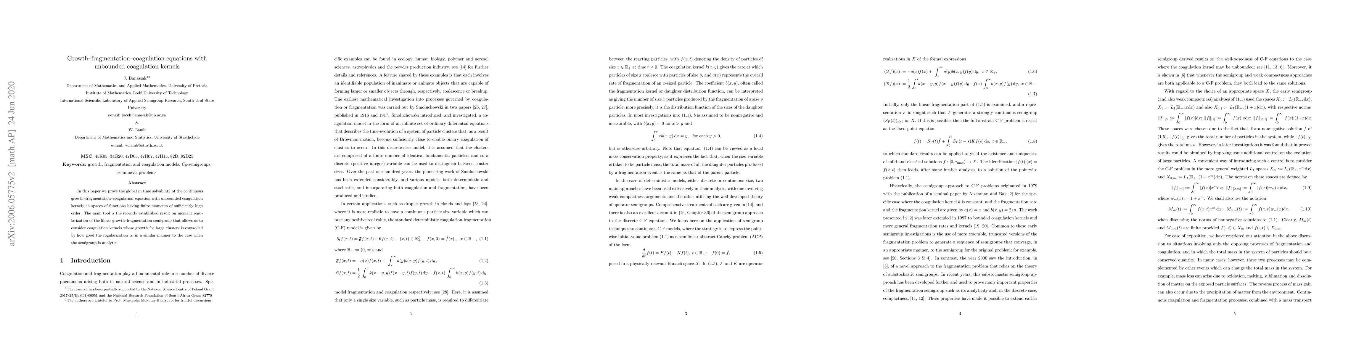 This paper proves the global existence of solutions to the growth-fragmentation-coagulation equation with unbounded coagulation kernels, utilizing moment regularization techniques to handle large cluster growth, extending the applicability of these methods beyond analytic semigroups.