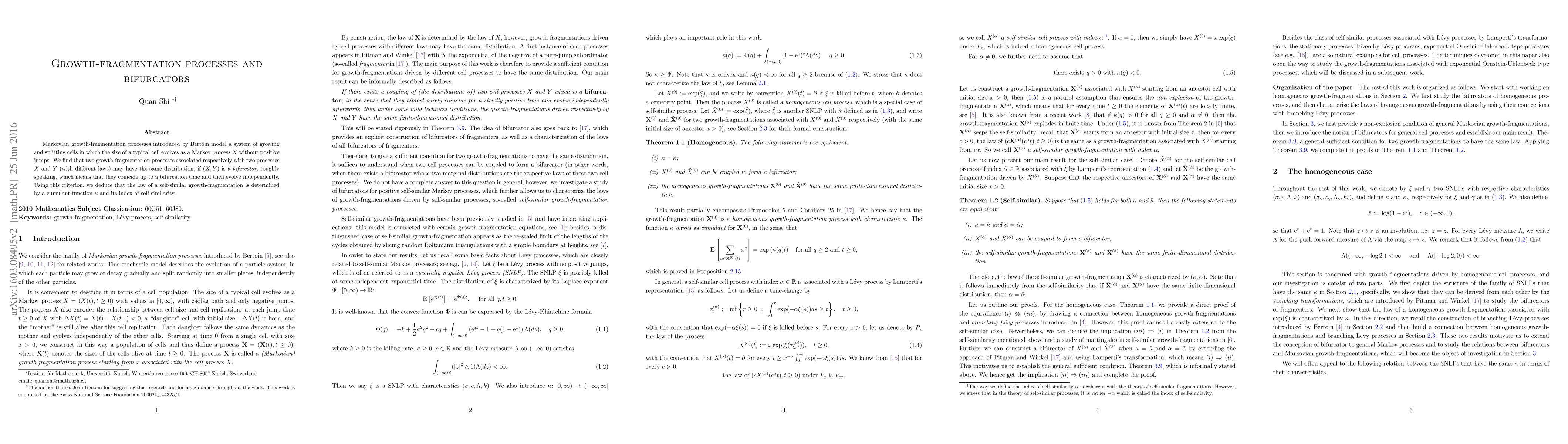 This paper explores Markovian growth-fragmentation processes, showing that two such processes with different underlying laws can share the same distribution if they are bifurcators. It concludes that the self-similarity of these processes is determined by a cumulant function and its index of self-similarity.