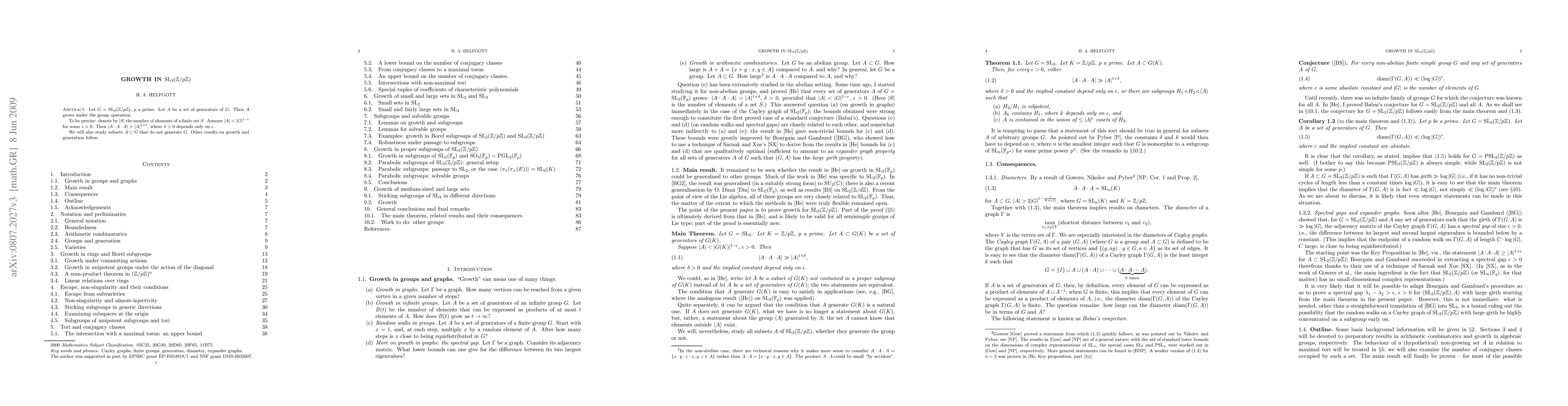 Let G=SL_3(Z/pZ), p a prime. Let A be a set of generators of G. Then A grows under the group operation. To be precise: denote by |S| the number of elements of a finite set S. Assume |A| < |G|^{1-\epsilon} for some \epsilon>0. Then |A\cdot A\cdot A|>|A|^{1+\delta}, where \delta>0 depends only on \epsilon. We also study subsets A\subset G that do not generate G. Other results on growth and generation follow.