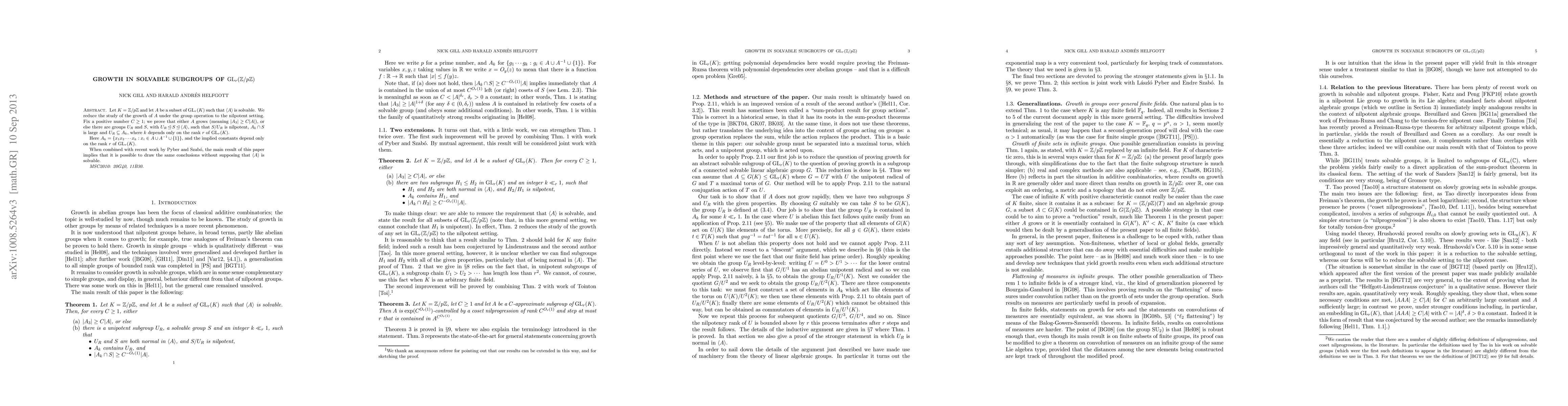 Let $K=Z/pZ$ and let $A$ be a subset of $\GL_r(K)$ such that $$ is solvable. We reduce the study of the growth of $A$ under the group operation to the nilpotent setting. Specifically we prove that either $A$ grows rapidly (meaning $|A\cdot A\cdot A|\gg |A|^{1+\delta}$), or else there are groups $U_R$ and $S$, with $S/U_R$ nilpotent such that $A_k\cap S$ is large and $U_R\subseteq A_k$, where $k$ is a bounded integer and $A_k = \{x_1 x_2...b x_k : x_i \in A \cup A^{-1} \cup {1}}$. The implied constants depend only on the rank $r$ of $\GL_r(K)$. When combined with recent work by Pyber and Szab\'o, the main result of this paper implies that it is possible to draw the same conclusions without supposing that $$ is solvable.