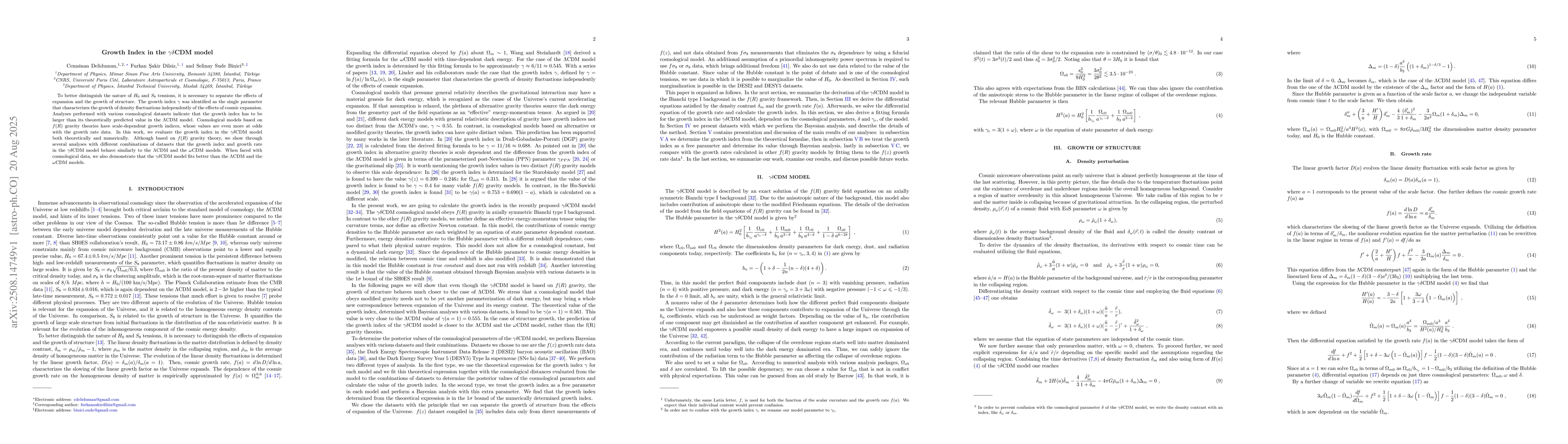 The paper presents a theoretical formula for the growth index in the $\\gamma\\delta$CDM model and demonstrates its numerical evaluation, comparing it with other models.
