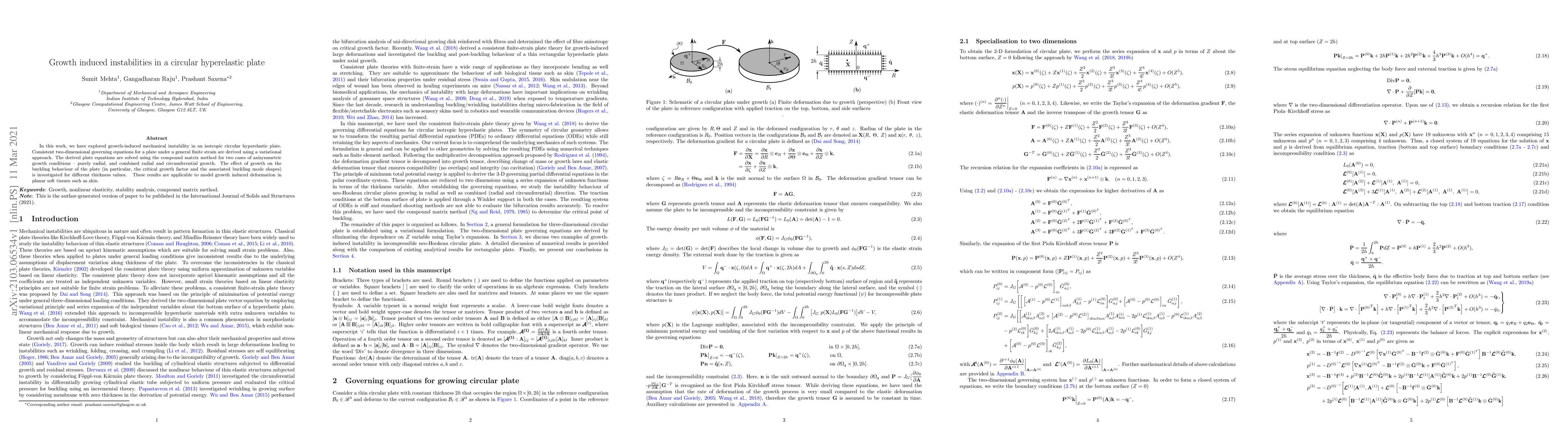 This paper investigates growth-induced mechanical instability in circular hyperelastic plates under finite strain, deriving governing equations via a variational approach and solving them for radial and combined radial-circumferential growth. The study examines the impact of growth on buckling behavior, relevant for modeling deformation in soft tissues like skin.