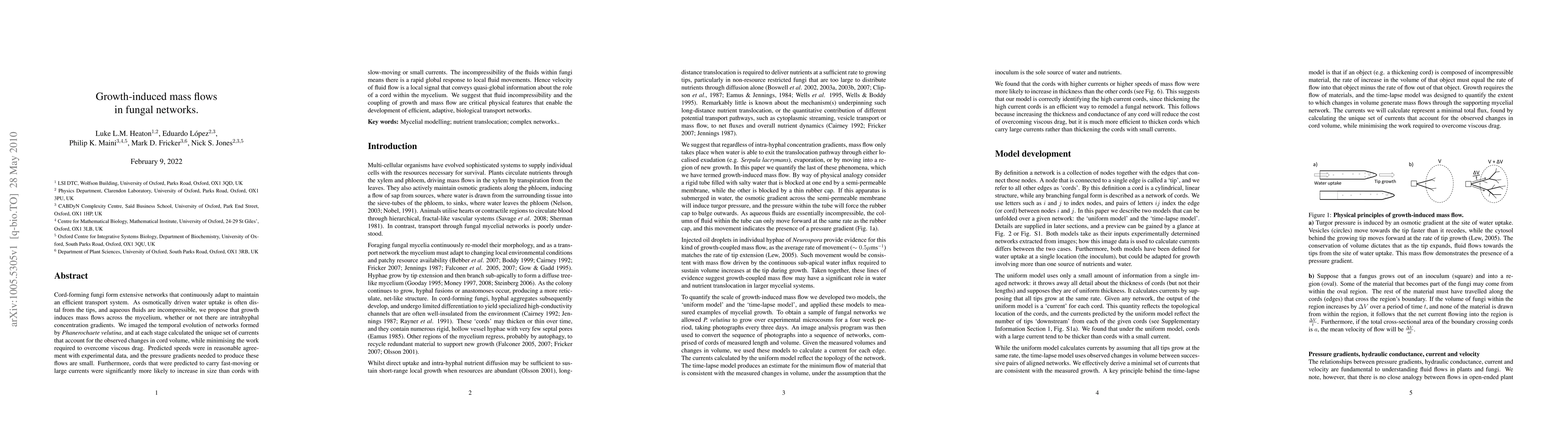 Cord-forming fungi form extensive networks that continuously adapt to maintain an efficient transport system. As osmotically driven water uptake is often distal from the tips, and aqueous fluids are incompressible, we propose that growth induces mass flows across the mycelium, whether or not there are intrahyphal concentration gradients. We imaged the temporal evolution of networks formed by Phanerochaete velutina, and at each stage calculated the unique set of currents that account for the observed changes in cord volume, while minimising the work required to overcome viscous drag. Predicted speeds were in reasonable agreement with experimental data, and the pressure gradients needed to produce these flows are small. Furthermore, cords that were predicted to carry fast-moving or large currents were significantly more likely to increase in size than cords with slow-moving or small currents. The incompressibility of the fluids within fungi means there is a rapid global response to local fluid movements. Hence velocity of fluid flow is a local signal that conveys quasi-global information about the role of a cord within the mycelium. We suggest that fluid incompressibility and the coupling of growth and mass flow are critical physical features that enable the development of efficient, adaptive, biological transport networks.
