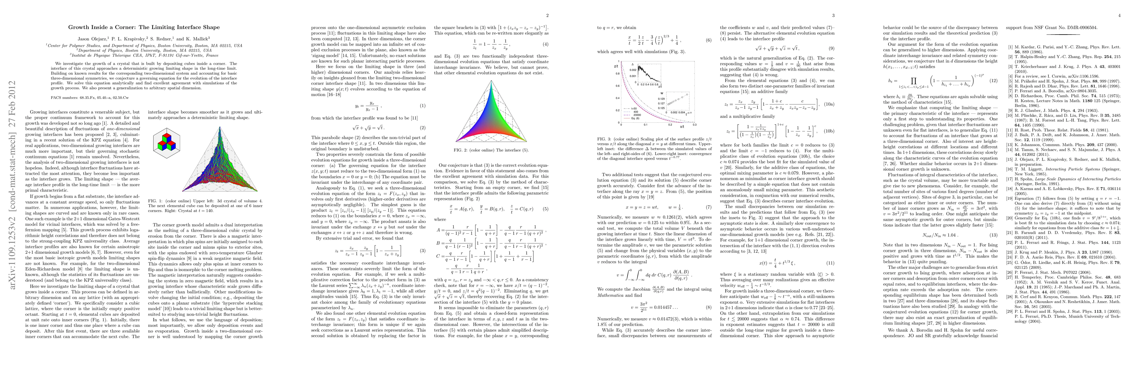 This paper studies the growth of a crystal formed by depositing cubes inside a corner, deriving a conjectured governing equation for the interface's limiting shape. Analytical solutions match simulation results, and the findings are generalized to any spatial dimension.