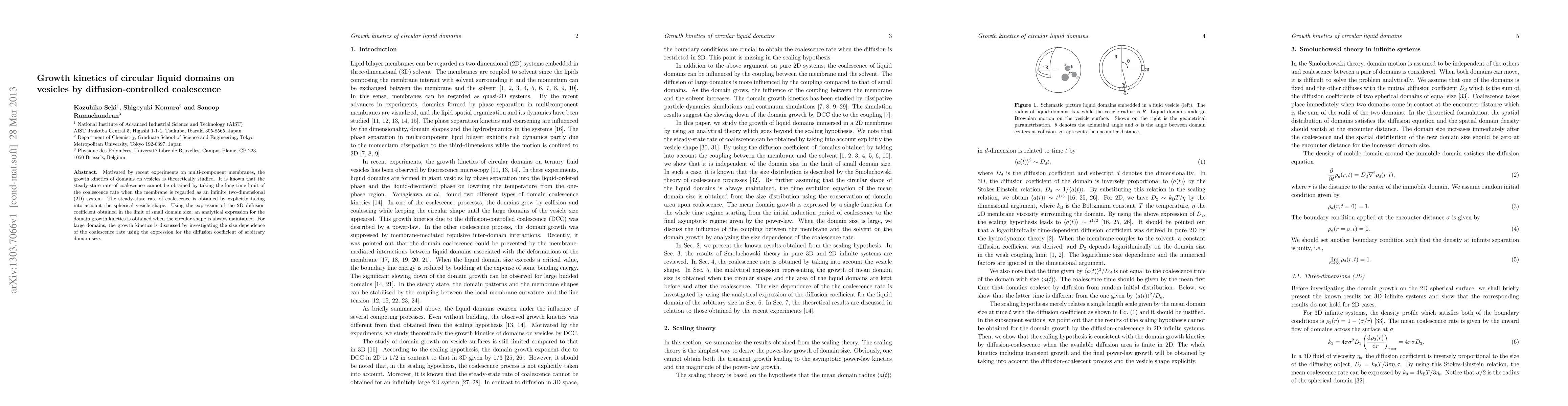 This research derives an analytical expression for the growth kinetics of circular liquid domains on spherical vesicles, achieved by considering the vesicle's shape and the size-dependent diffusion coefficient. It also discusses growth for larger domains by investigating coalescence rate size dependence.