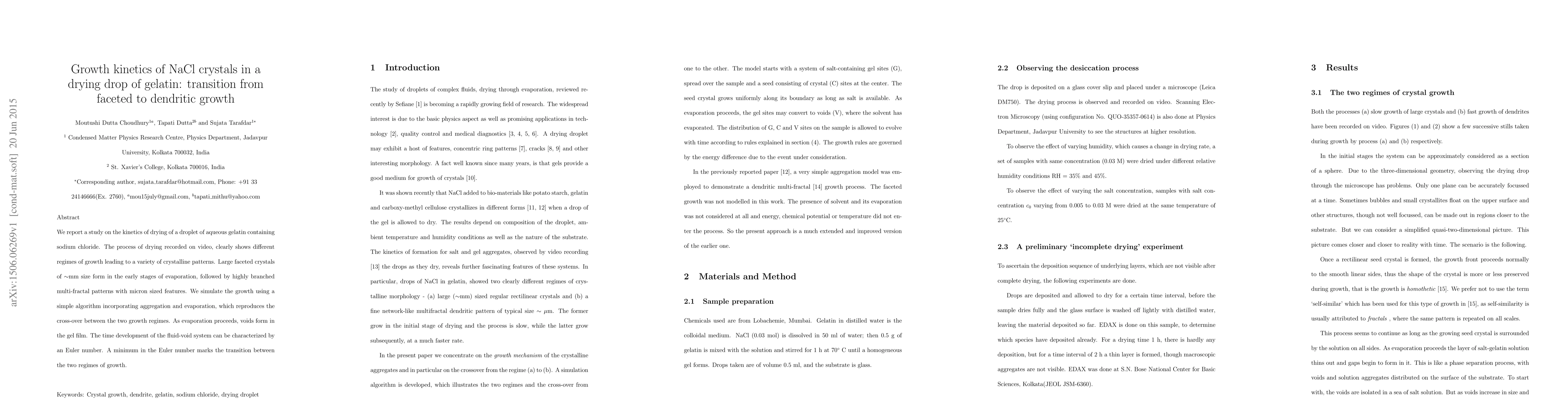 This study investigates the growth kinetics of NaCl crystals in drying gelatin droplets, revealing a transition from faceted to dendritic growth patterns. The transition is marked by a minimum in the Euler number, correlating with the formation of voids in the gel film.