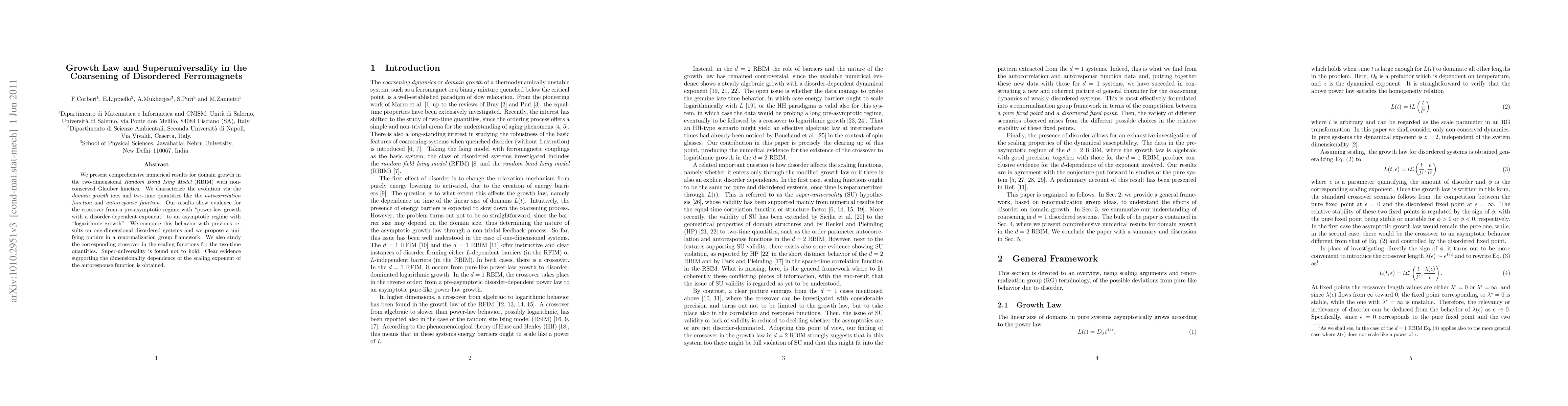 We present comprehensive numerical results for domain growth in the two-dimensional {\it Random Bond Ising Model} (RBIM) with nonconserved Glauber kinetics. We characterize the evolution via the {\it domain growth law}, and two-time quantities like the {\it autocorrelation function} and {\it autoresponse function}. Our results clearly establish that the growth law shows a crossover from a pre-asymptotic regime with "power-law growth with a disorder-dependent exponent" to an asymptotic regime with "logarithmic growth". We compare this behavior with previous results on one-dimensional disordered systems and we propose a unifying picture in a renormalization group framework. We also study the corresponding crossover in the scaling functions for the two-time quantities. Super-universality is found not to hold. Clear evidence supporting the dimensionality dependence of the scaling exponent of the autoresponse function is obtained.