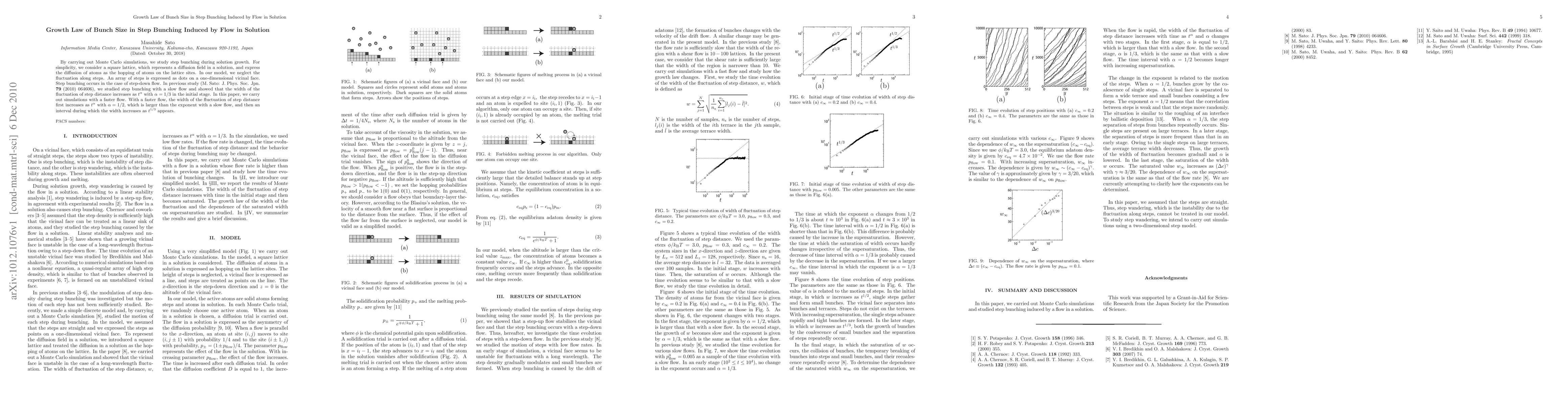 This paper uses Monte Carlo simulations to study step bunching on a square lattice representing a diffusion field in solution, focusing on how faster flow influences the growth law. Initially, the width of step distance fluctuations increases with time as $t^{1/2}$, then transitions to $t^{1/3}$ after a certain interval.