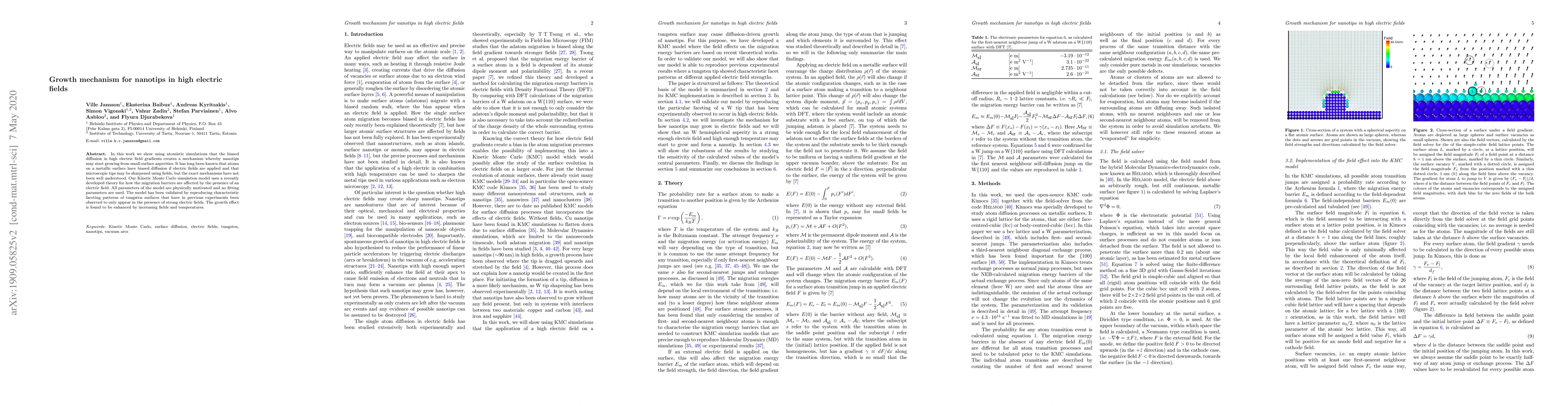 Researchers found that high electric fields can cause nanotips to grow from small surface asperities through biased diffusion, which is enhanced by increasing fields and temperatures.