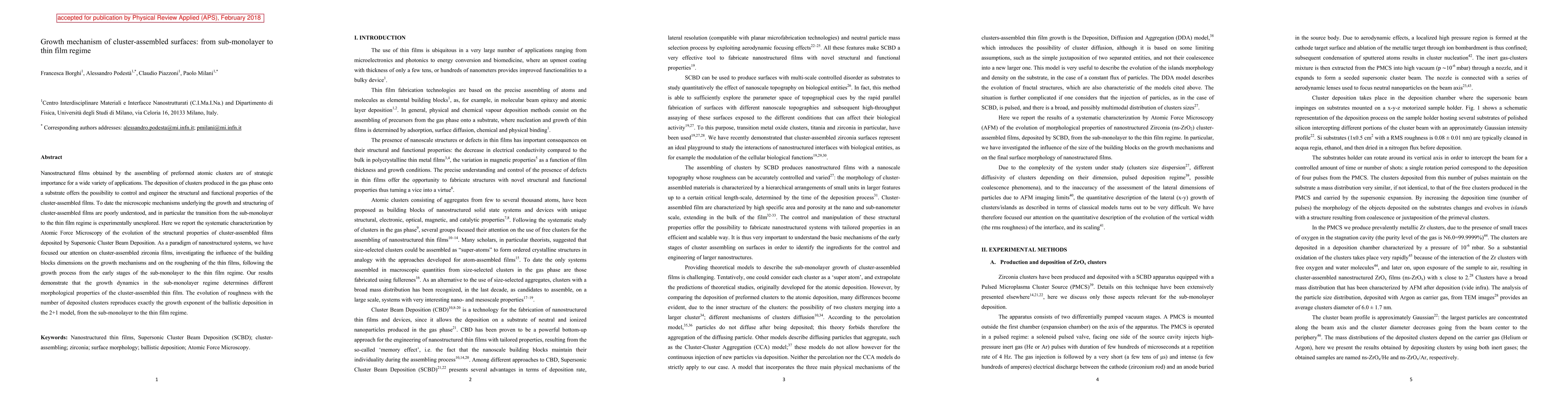 This paper investigates the growth mechanism of cluster-assembled zirconia films using Atomic Force Microscopy, revealing that the growth dynamics in the sub-monolayer regime significantly influence the film's morphology and roughness, following the ballistic deposition model.
