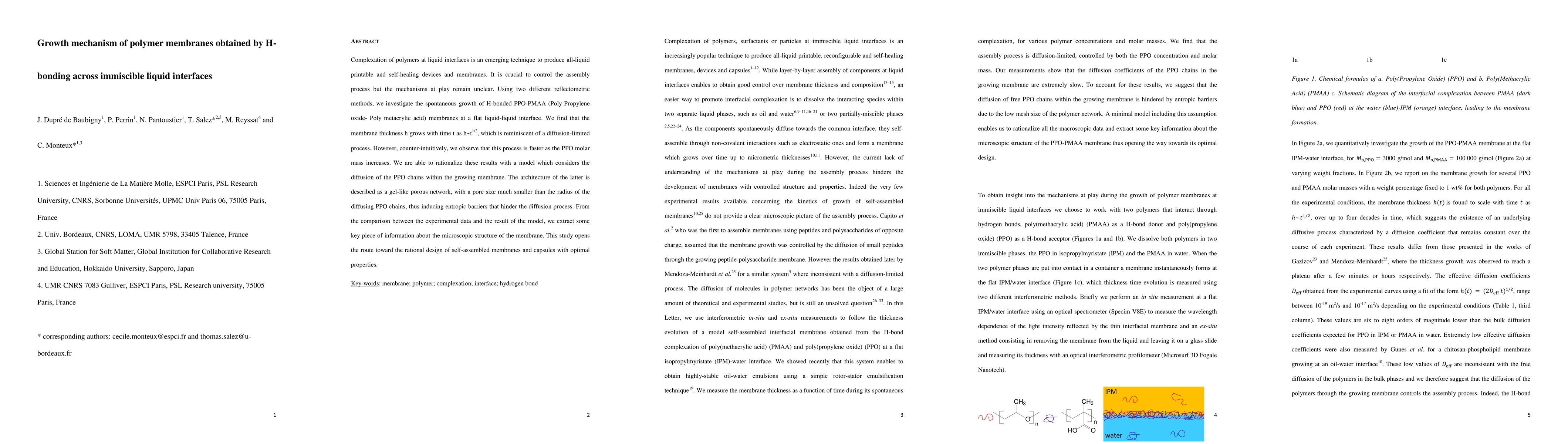 Complexation of polymers at liquid interfaces is an emerging technique to produce all-liquid printable and self-healing devices and membranes. It is crucial to control the assembly process but the mechanisms at play remain unclear. Using two different reflectometric methods, we investigate the spontaneous growth of H-bonded PPO-PMAA membranes at a flat liquid-liquid interface. We find that the membrane thickness h grows with time t as h~t^(1/2), which is reminiscent of a diffusion-limited process. However, counter-intuitively, we observe that this process is faster as the PPO molar mass increases. We are able to rationalize these results with a model which considers the diffusion of the PPO chains within the growing membrane. The architecture of the latter is described as a gel-like porous network, with a pore size much smaller than the radius of the diffusing PPO chains, thus inducing entropic barriers that hinder the diffusion process. From the comparison between the experimental data and the result of the model, we extract some key piece of information about the microscopic structure of the membrane. This study opens the route toward the rational design of self-assembled membranes and capsules with optimal properties.