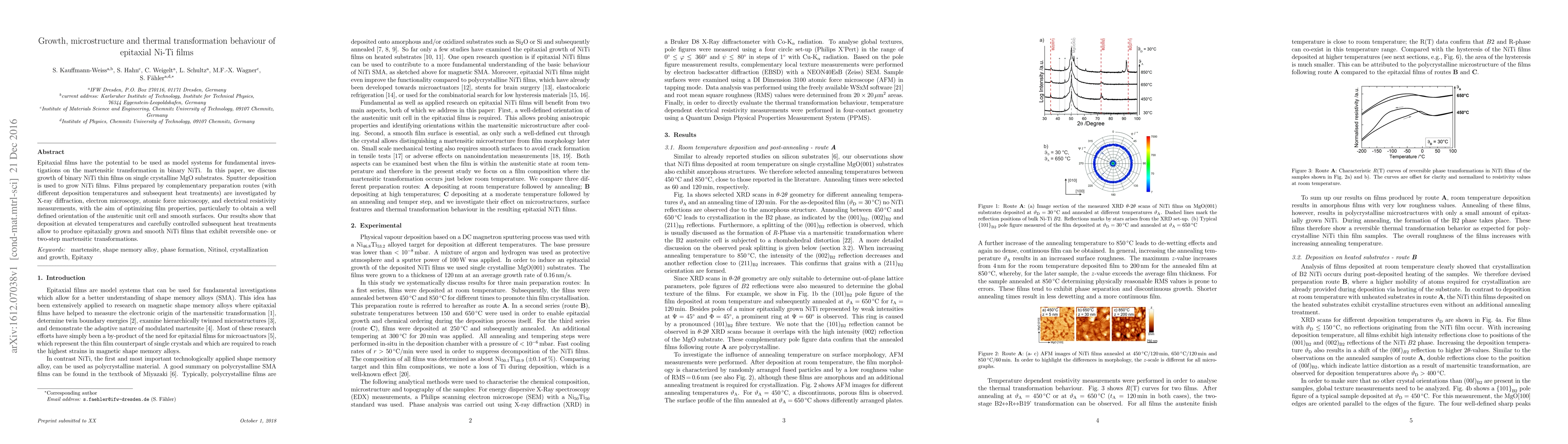 This paper explores the growth and microstructure of epitaxial NiTi thin films using sputter deposition on MgO substrates, focusing on optimizing film properties through varied deposition temperatures and heat treatments. The study reveals that elevated deposition temperatures and controlled heat treatments yield smooth films with well-defined austenitic unit cells and reversible martensitic transformations.