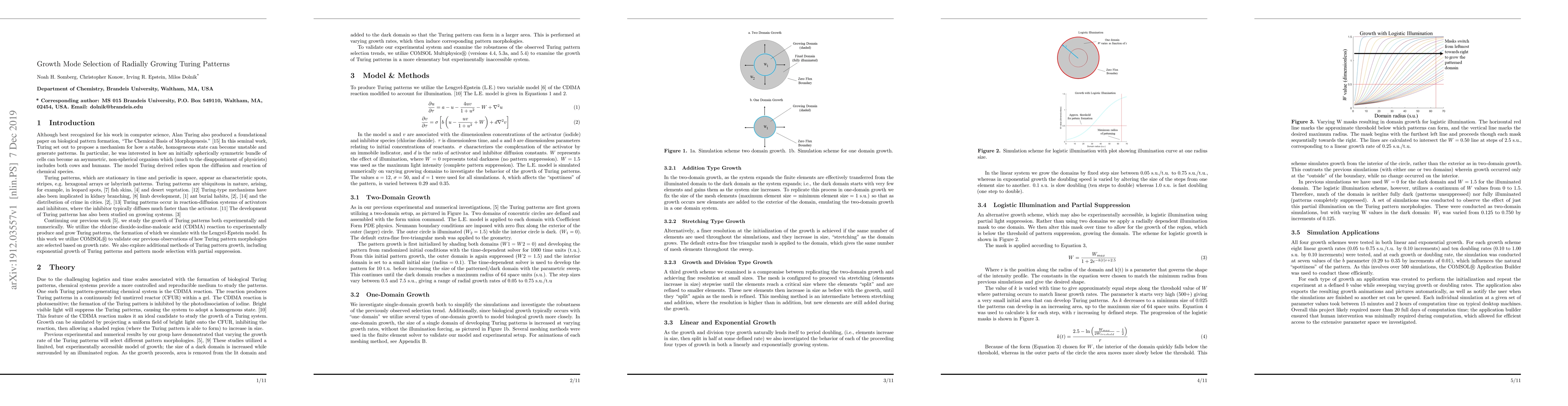 We study Turing pattern formation in a system undergoing radial growth in two dimensions. The Lengyel-Epstein two variable model is implemented in COMSOL Multiphysics and solved on domains growing at different speeds while sweeping other parameters to examine a wide range of Turing pattern morphologies. By altering the configuration of the finite element mesh, we examine patterning in several simulation growth modes. The observed pattern morphologies match previously observed trends for Turing pattern growth modes. Fast growth leads to pattern formation parallel to the growing boundary, intermediate growth leads to pattern formation perpendicular to the growing boundary, and slow growth leads to pattern growth from the interior. Exponential growth leads to the expected fast-growth mode of pattern formation parallel to the moving boundary. Simulations to replicate interior growth using logistic illumination do not show simple pattern trends due to the effects of partial pattern suppression from the illumination.