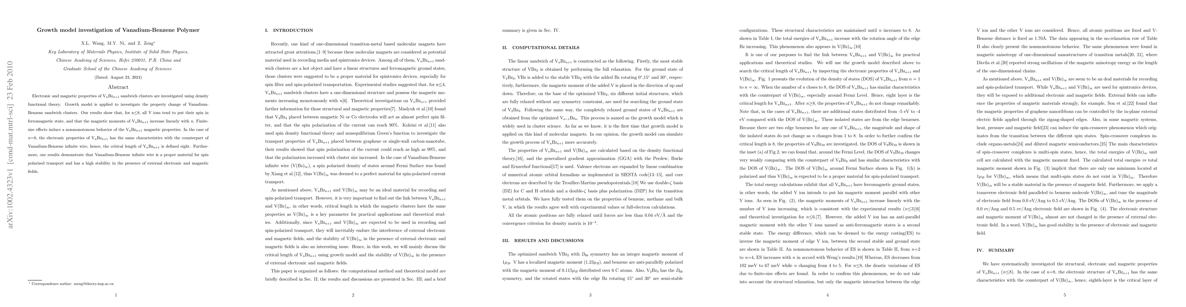 Electronic and magnetic properties of VnBzn+1 sandwich clusters are investigated using density functional theory. Growth model is applied to investigate the property change of Vanadium-Benzene sandwich clusters. Our results show that, for n<8, all V ions tend to put their spin in ferromagnetic state, and that the magnetic moments of VnBzn+1 increase linearly with n. Finite-size effects induce a nonmonotonous behavior of the VnBzn+1 magnetic properties. In the case of n=8, the electronic properties of VnBzn+1 has the same characteristics with the counterpart of Vanadium-Benzene infinite wire, hence, the critical length of VnBzn+1 is defined eight. Furthermore, our results demonstrate that Vanadium-Benzene infinite wire is a proper material for spin polarized transport and has a high stability in the presence of external electronic and magnetic fields.